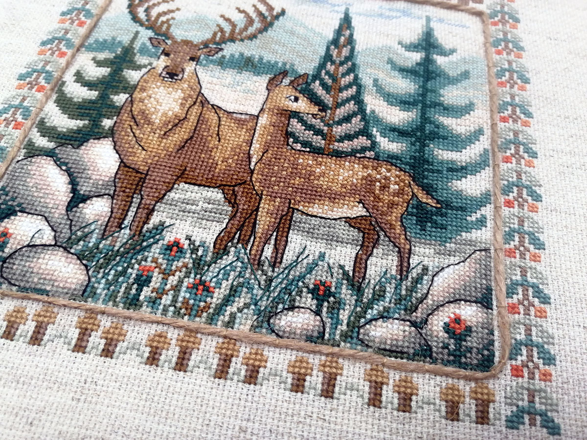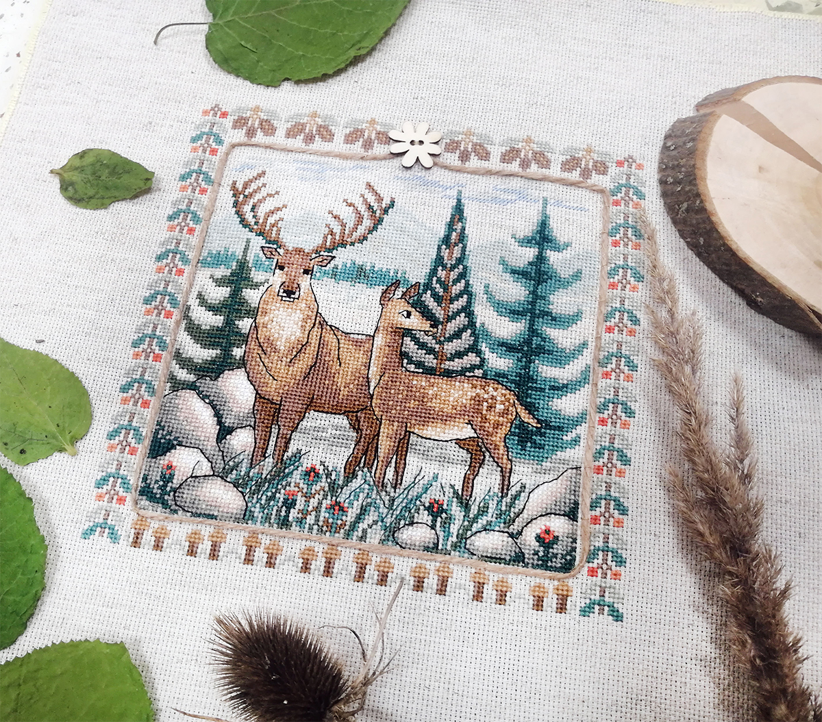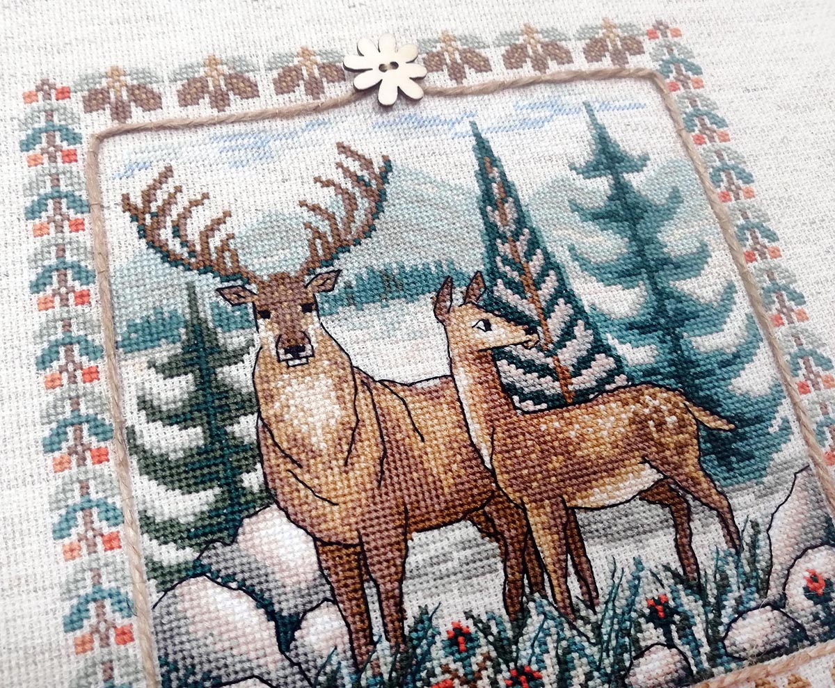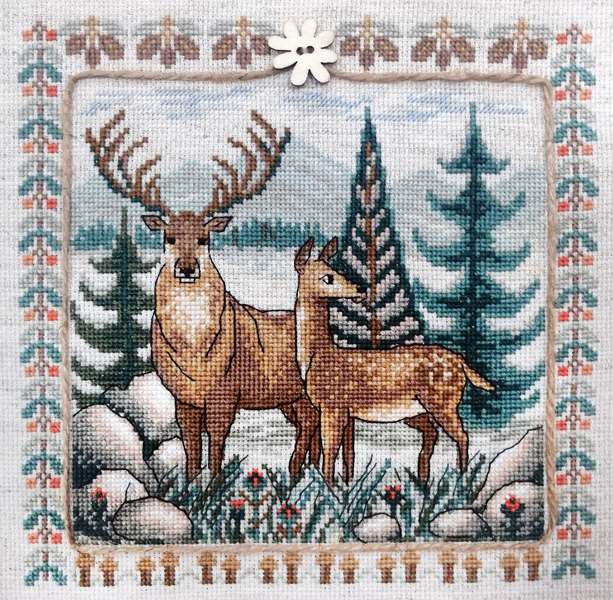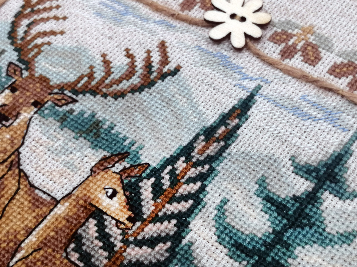 В каждом наборе: канва Аида 16 рустико под лен и декоративные элементы: деревянная пуговица и бечевка.