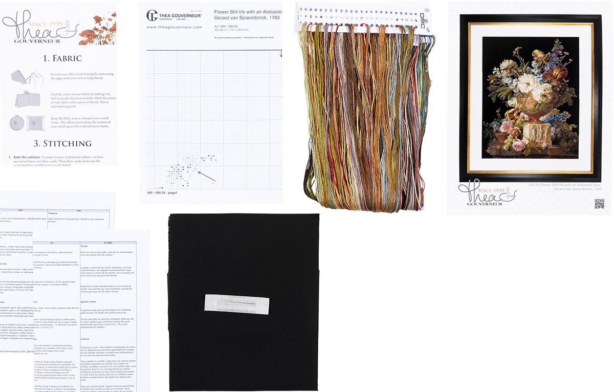 Наборы Thea Gouverneur укомплектованы качественными материалами, такими как мулине DMC из 100% хлопка и разные виды тканей для вышивания производства Zweigart. Наборы обозначенные буквой А после номера содержат в составе канву Aida, если в артикуле есть обозначение .05 – то этот набор укомплектован канвой Aida чёрного цвета. Также в ассортименте есть наборы на 100% льне и канве Jobelan. Черно-белые схемы тщательно прорабатываются вручную. Используется богатая цветовая палитра ниток, но в ассортименте компании есть и монохромные дизайны. Нитки разобраны по символам и закреплены на органайзере. Стрелка на бумажном органайзере указывает вверх, определяя правильность чтения символов.