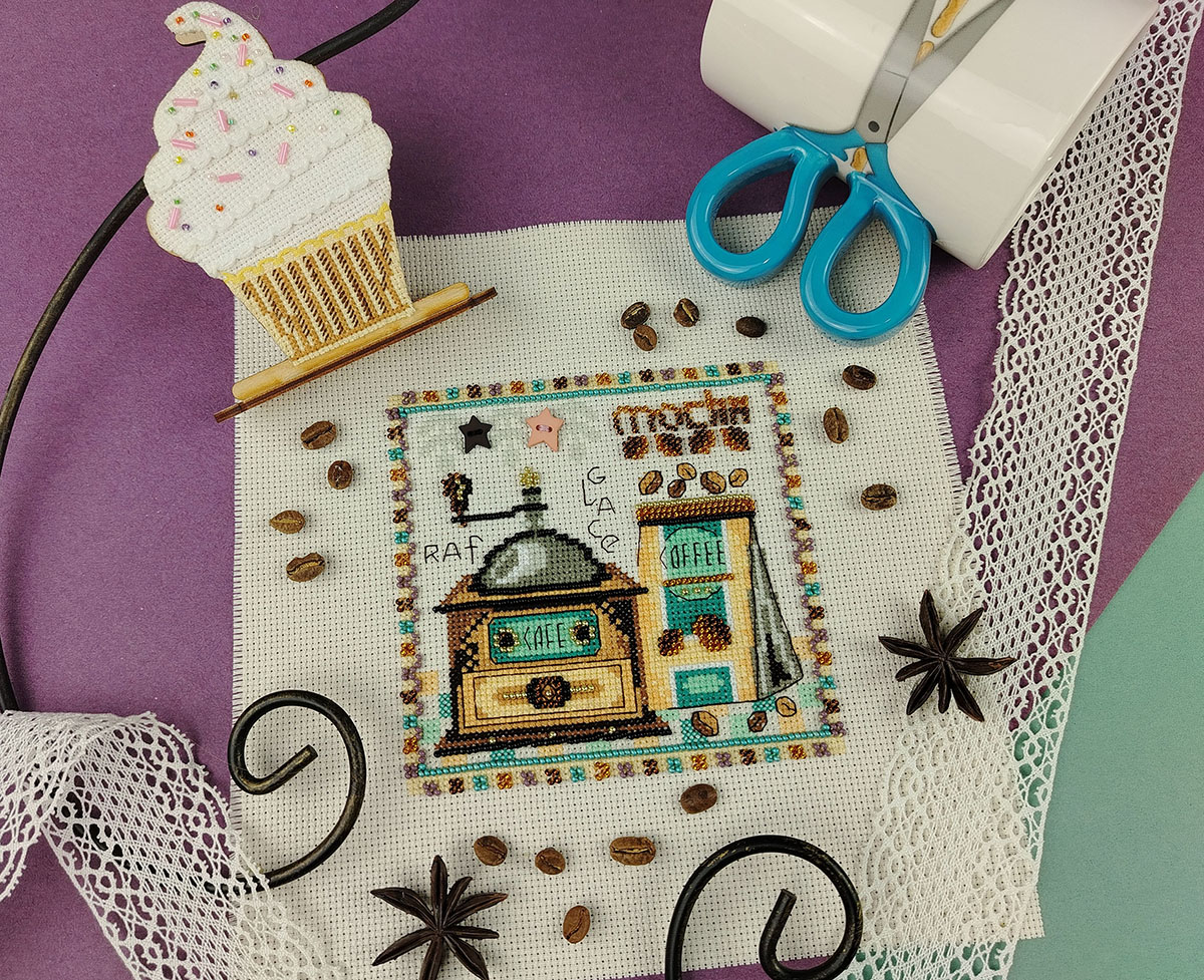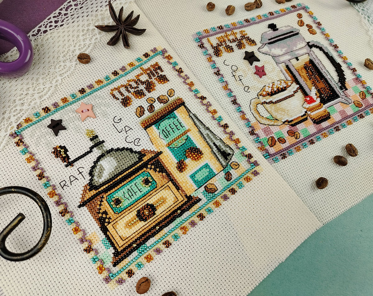 Серию объединяют размер, основа Аида 14ct, частичная вышивка бисером и декоративные пришивные элементы. Мулине Finca не разобраны на планшетки, а связаны узелком. Схема и инструкция черно-белая. Электронная схема XSD, QR код в наборе, указание о наличие схемы - знак на обложке.