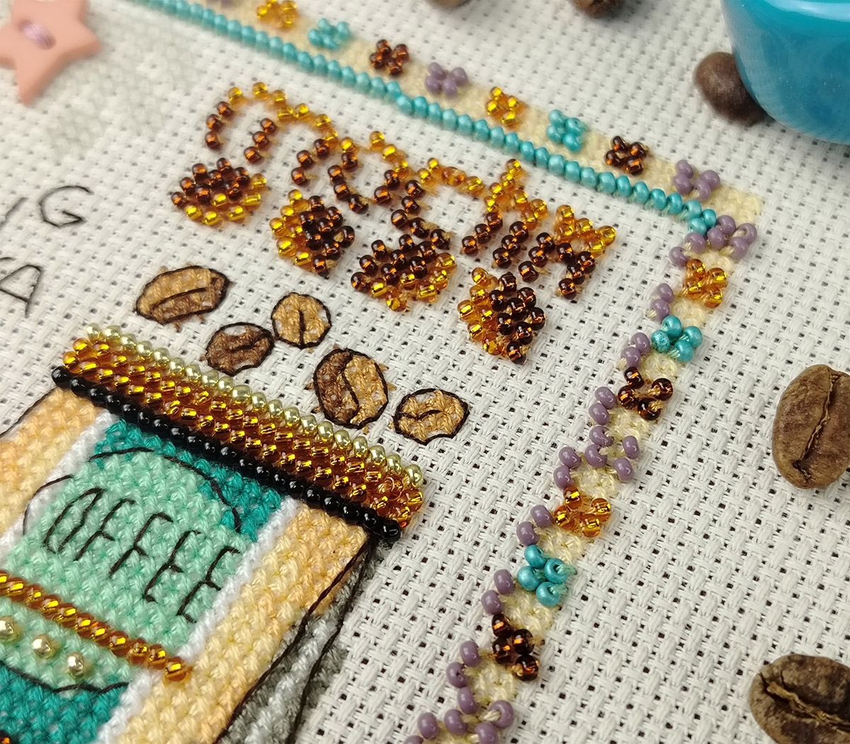 канва Aida 14 ct бежевая, мулине Finca 10 цв., декоративные элементы, бисер, игла, инструкция, схема черно-белая