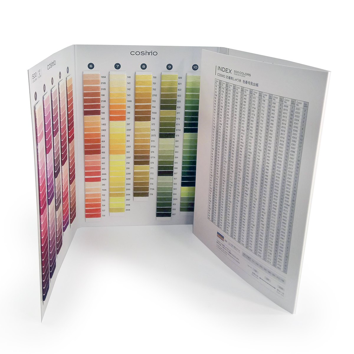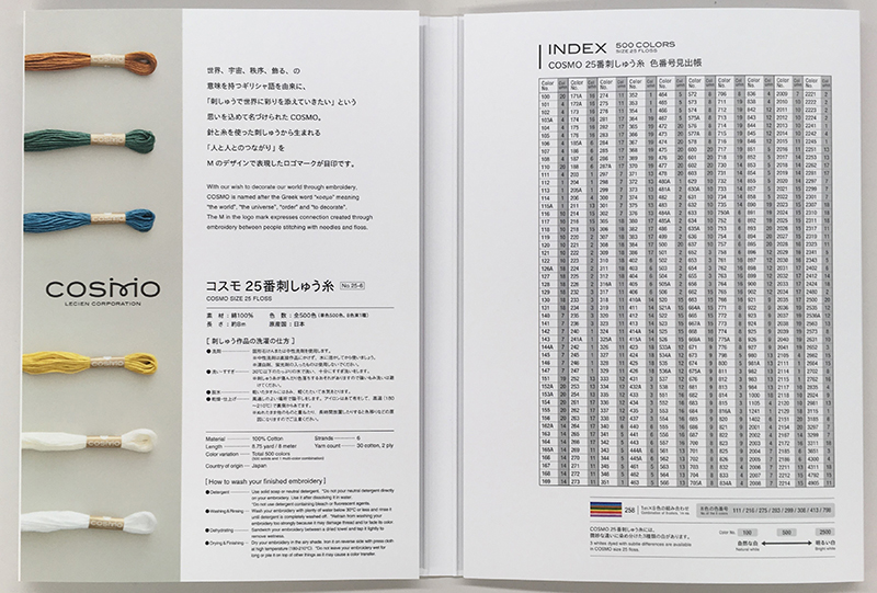 Карта цветов легендарных однотонных нитей COSMO №25-6 на 500 цветов. Поможет правильно подобрать цвета нитей для Вашей вышивки. Благодаря эксклюзивной системе окраски нитей был достигнут удивительный уровень сохранения цвета и оттенков, включая самые нежные цвета. Качество нитей не останавливается на достигнутом, инженеры постоянно внедряют новые технологии для улучшения мулине. Мулине Cosmo обладает непревзойденной мягкостью и легкостью в работе.