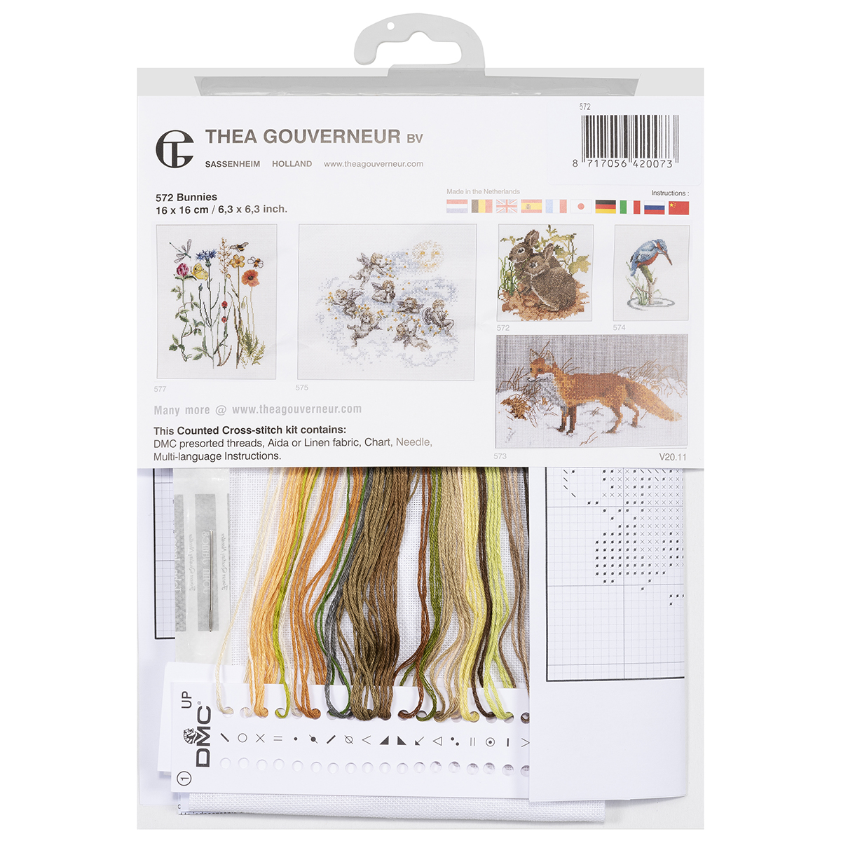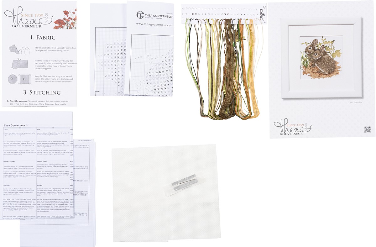 Наборы Thea Gouverneur укомплектованы качественными материалами, такими как мулине DMC из 100% хлопка и разные виды тканей для вышивания производства Zweigart. Наборы обозначенные буквой А после номера содержат в составе канву Aida, если в артикуле есть обозначение .05 – то этот набор укомплектован канвой Aida чёрного цвета. Также в ассортименте есть наборы на 100% льне и канве Jobelan. Черно-белые схемы тщательно прорабатываются вручную. Используется богатая цветовая палитра ниток, но в ассортименте компании есть и монохромные дизайны. Нитки разобраны по символам и закреплены на органайзере. Стрелка на бумажном органайзере указывает вверх, определяя правильность чтения символов.