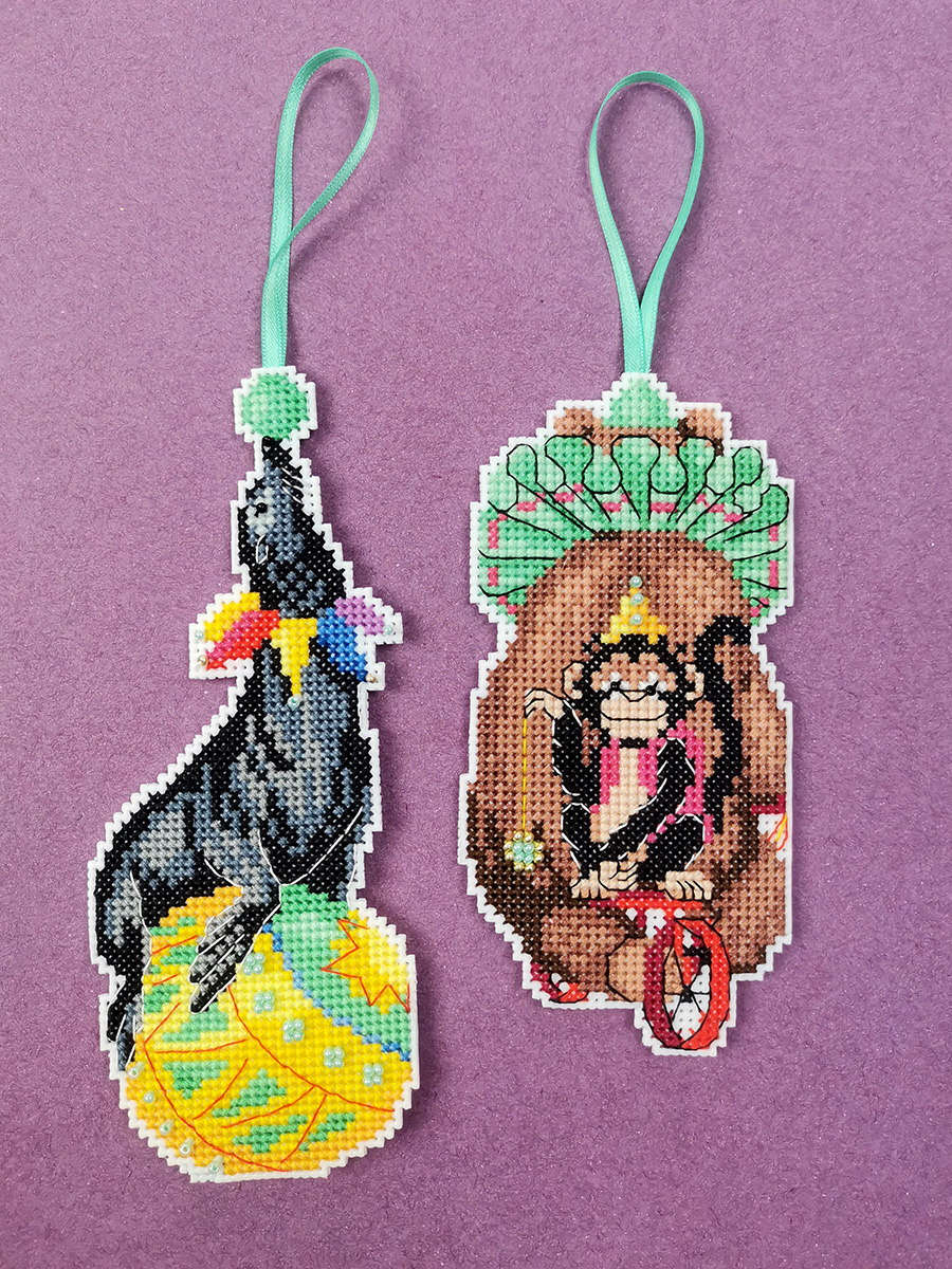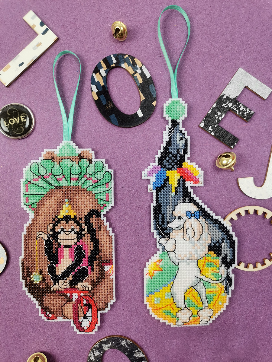 Канва пластиковая белая, мулине Finca 22 цв.,бисер, игла, инструкция, тесьма, схема комбинированная. В наборе две игрушки 7х13см