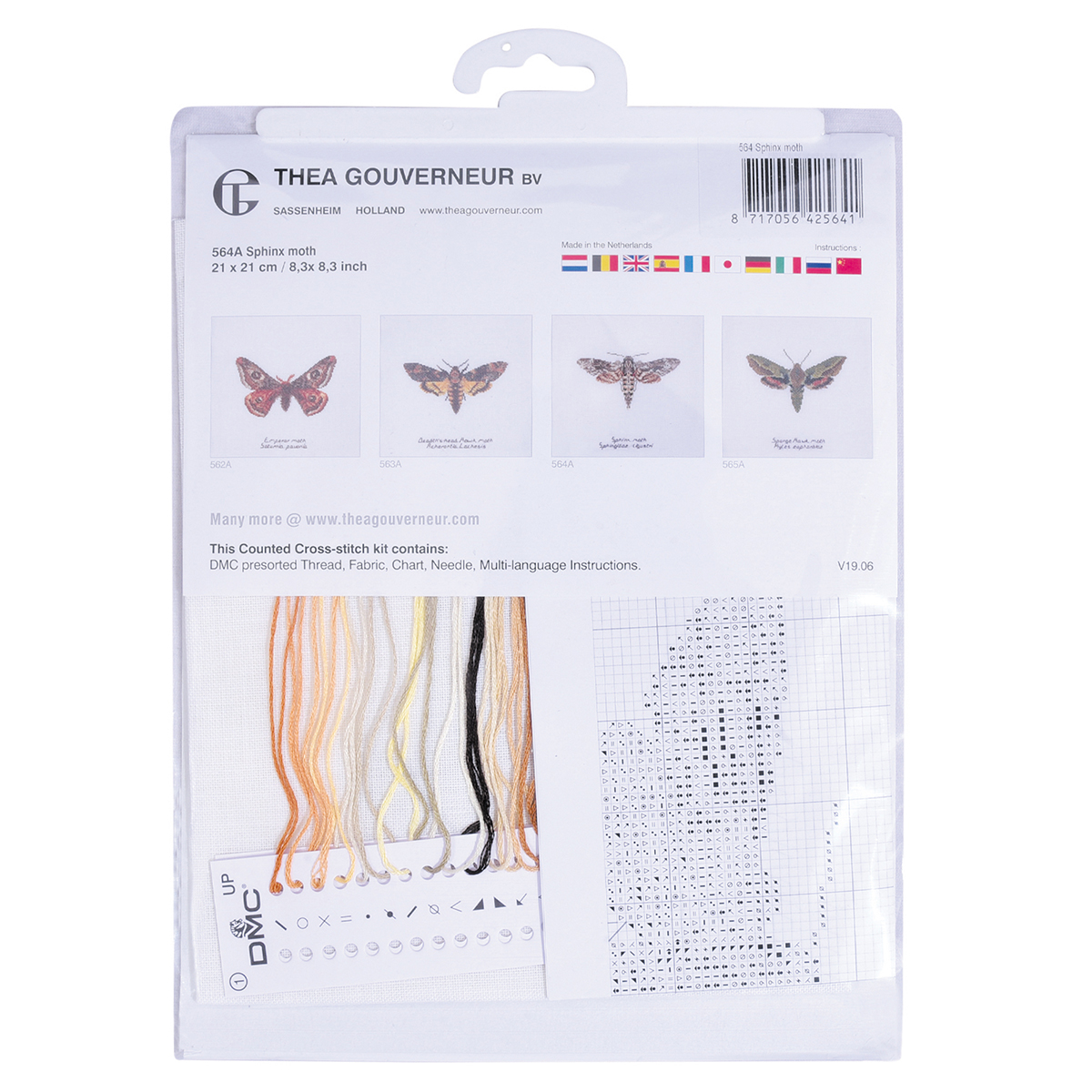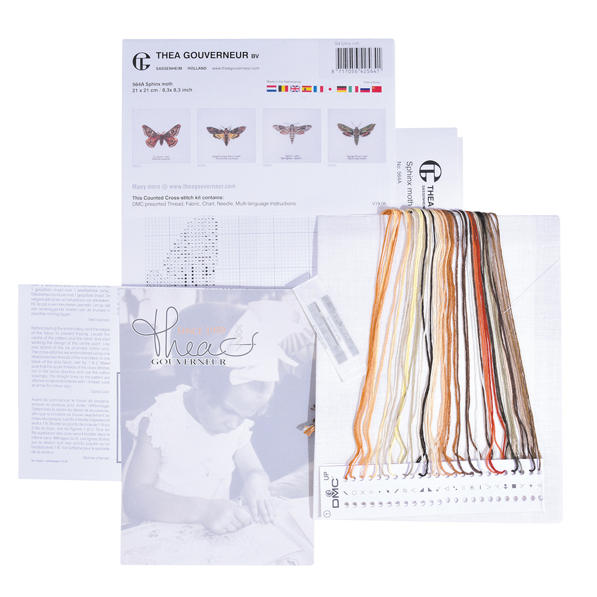 Наборы Thea Gouverneur укомплектованы качественными материалами, такими как мулине DMC из 100% хлопка и разные виды тканей для вышивания производства Zweigart. Наборы обозначенные буквой А после номера содержат в составе канву Aida, если в артикуле есть обозначение .05 – то этот набор укомплектован канвой Aida чёрного цвета. Также в ассортименте есть наборы на 100% льне и канве Jobelan. Черно-белые схемы тщательно прорабатываются вручную. Используется богатая цветовая палитра ниток, но в ассортименте компании есть и монохромные дизайны. Нитки разобраны по символам и закреплены на органайзере. Стрелка на бумажном органайзере указывает вверх, определяя правильность чтения символов.