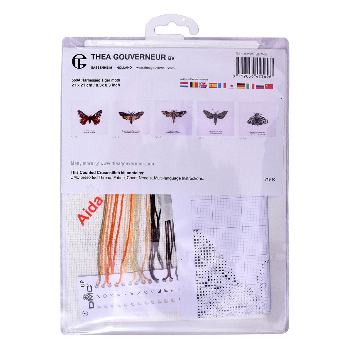 Наборы Thea Gouverneur укомплектованы качественными материалами, такими как мулине DMC из 100% хлопка и разные виды тканей для вышивания производства Zweigart. Наборы обозначенные буквой А после номера содержат в составе канву Aida, если в артикуле есть обозначение .05 – то этот набор укомплектован канвой Aida чёрного цвета. Также в ассортименте есть наборы на 100% льне и канве Jobelan. Черно-белые схемы тщательно прорабатываются вручную. Используется богатая цветовая палитра ниток, но в ассортименте компании есть и монохромные дизайны. Нитки разобраны по символам и закреплены на органайзере. Стрелка на бумажном органайзере указывает вверх, определяя правильность чтения символов.