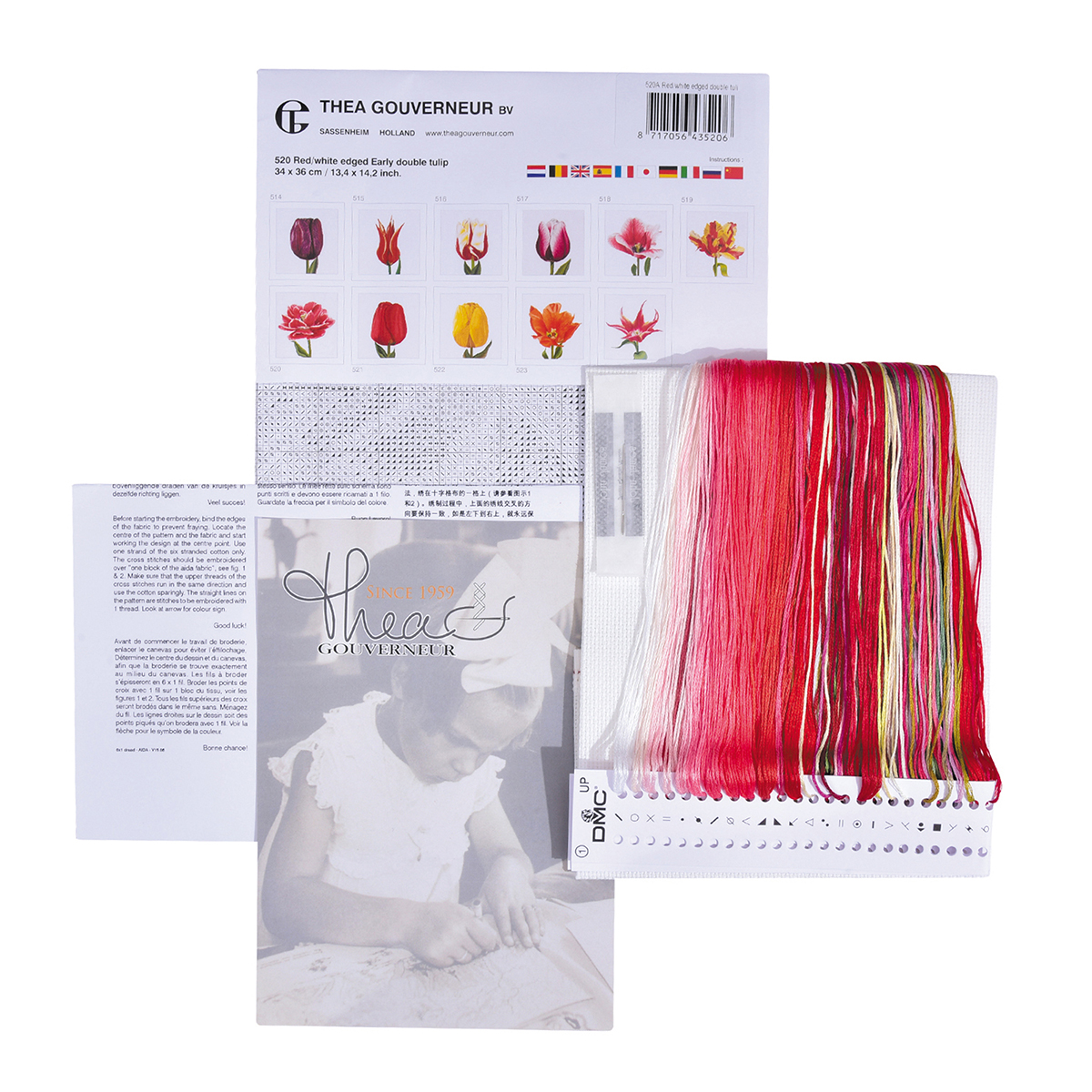 Наборы Thea Gouverneur укомплектованы качественными материалами, такими как мулине DMC из 100% хлопка и разные виды тканей для вышивания производства Zweigart. Наборы обозначенные буквой А после номера содержат в составе канву Aida, если в артикуле есть обозначение .05 – то этот набор укомплектован канвой Aida чёрного цвета. Также в ассортименте есть наборы на 100% льне и канве Jobelan. Черно-белые схемы тщательно прорабатываются вручную. Используется богатая цветовая палитра ниток, но в ассортименте компании есть и монохромные дизайны. Нитки разобраны по символам и закреплены на органайзере. Стрелка на бумажном органайзере указывает вверх, определяя правильность чтения символов.