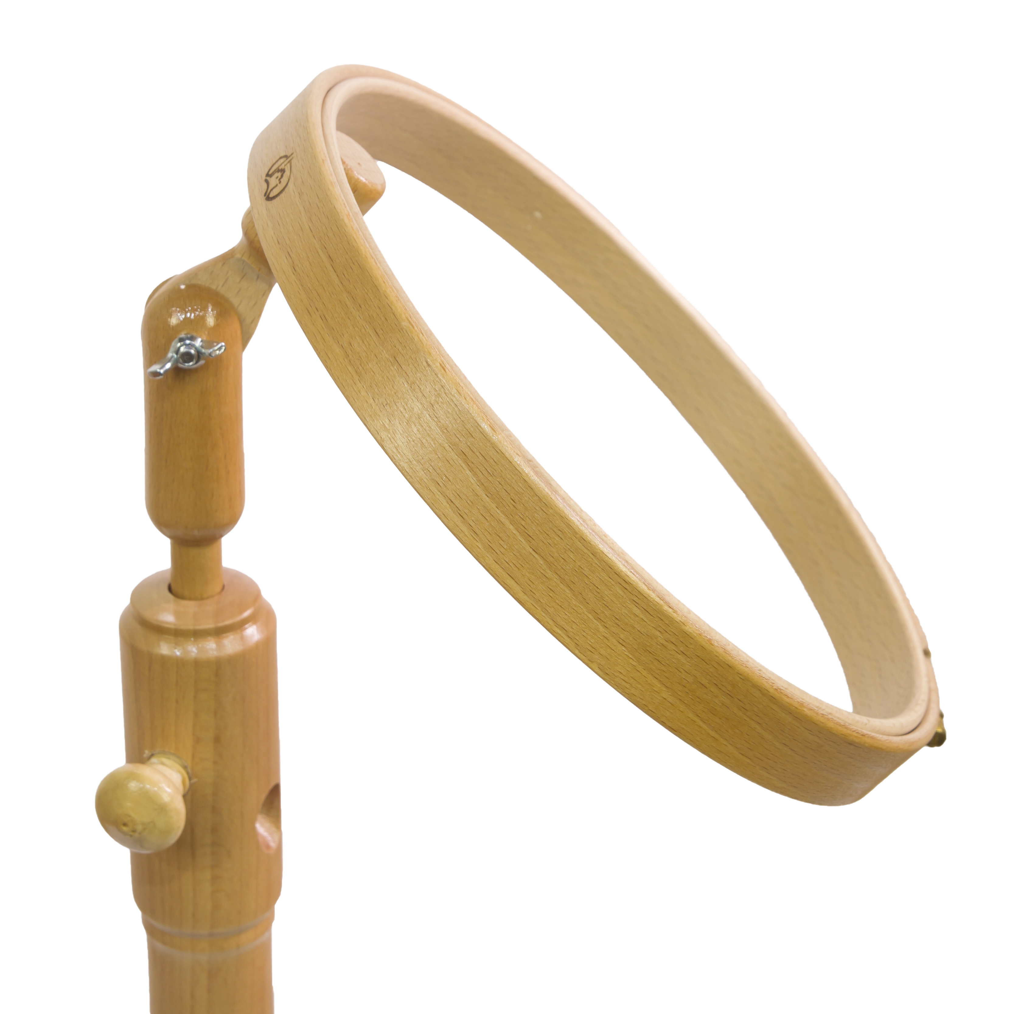 Напольные пяльцы, высота колец 26 мм, регулировка по высоте и углу наклона, высота стойки регулируемая 70-95 см, на стойке два крепежных отверстия для стоппера, материал – лакированный бук.