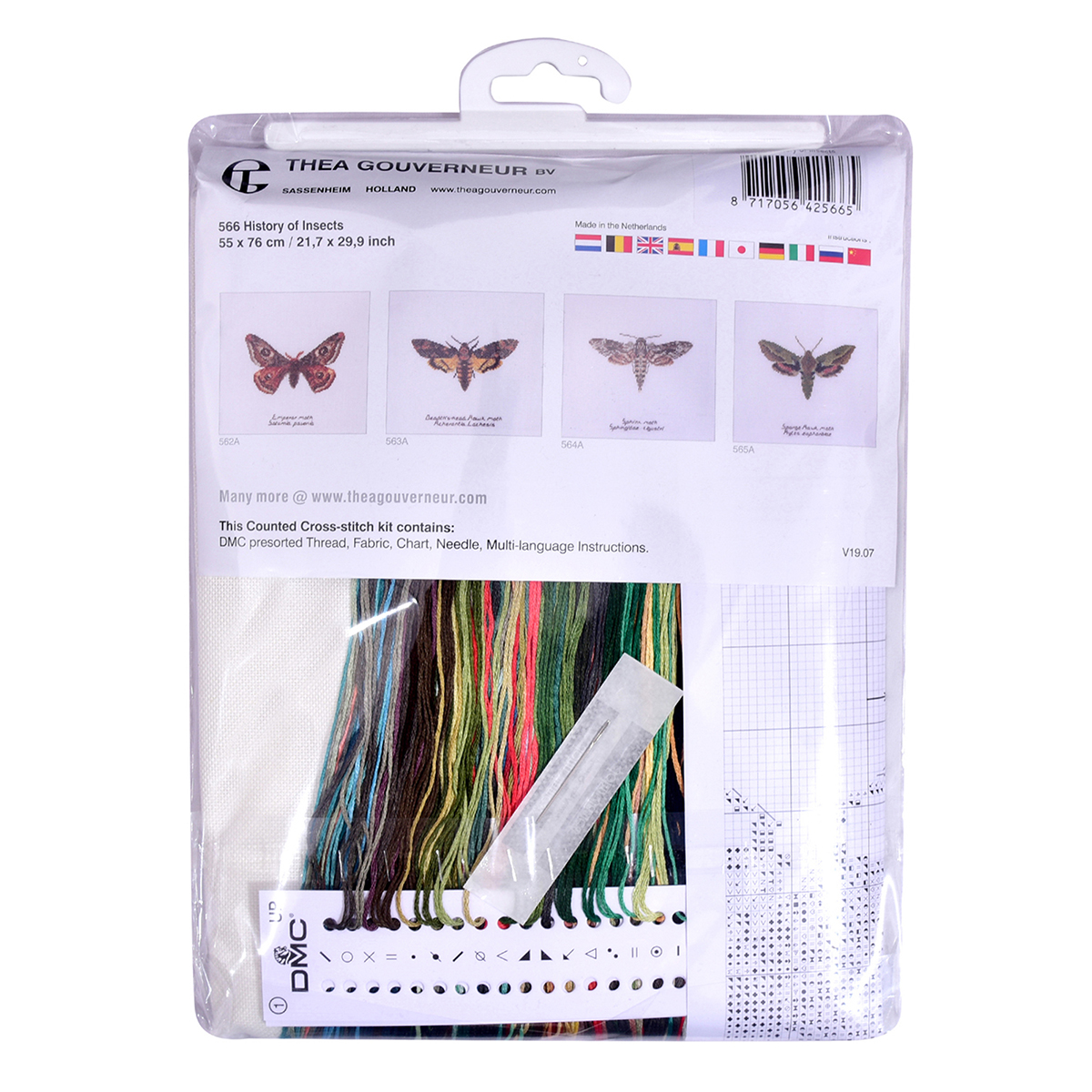 Наборы Thea Gouverneur укомплектованы качественными материалами, такими как мулине DMC из 100% хлопка и разные виды тканей для вышивания производства Zweigart. Наборы обозначенные буквой А после номера содержат в составе канву Aida, если в артикуле есть обозначение .05 – то этот набор укомплектован канвой Aida чёрного цвета. Также в ассортименте есть наборы на 100% льне и канве Jobelan. Черно-белые схемы тщательно прорабатываются вручную. Используется богатая цветовая палитра ниток, но в ассортименте компании есть и монохромные дизайны. Нитки разобраны по символам и закреплены на органайзере. Стрелка на бумажном органайзере указывает вверх, определяя правильность чтения символов.
