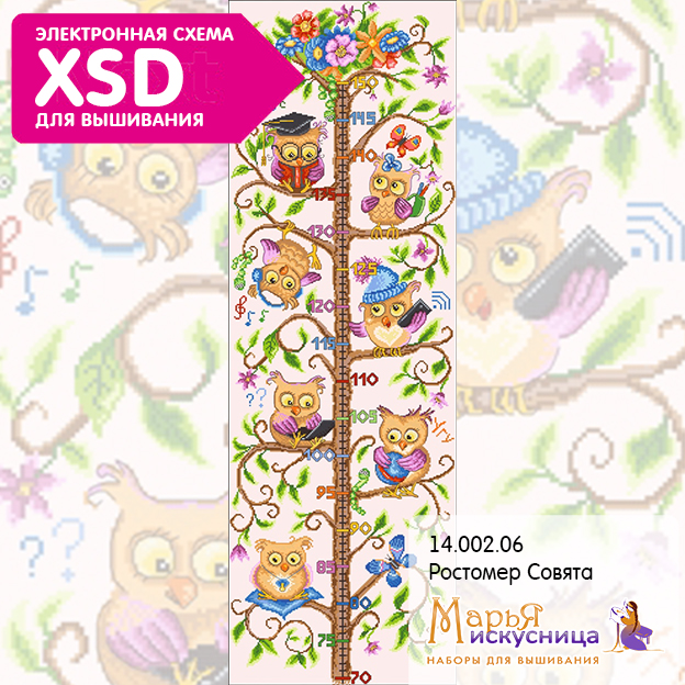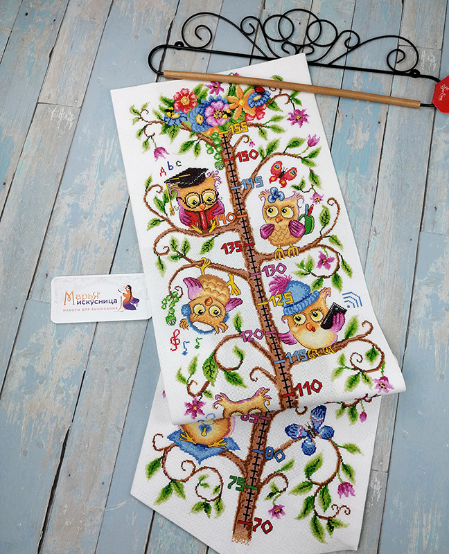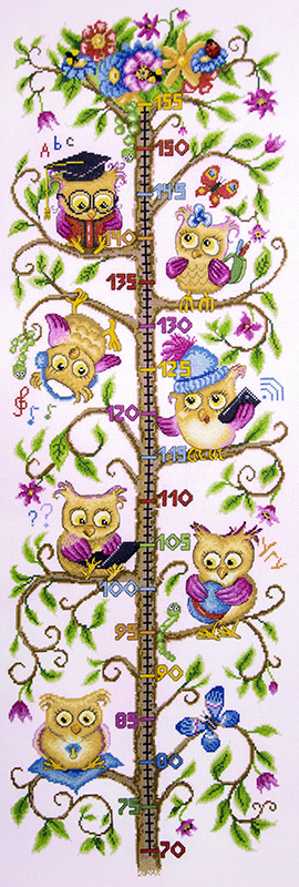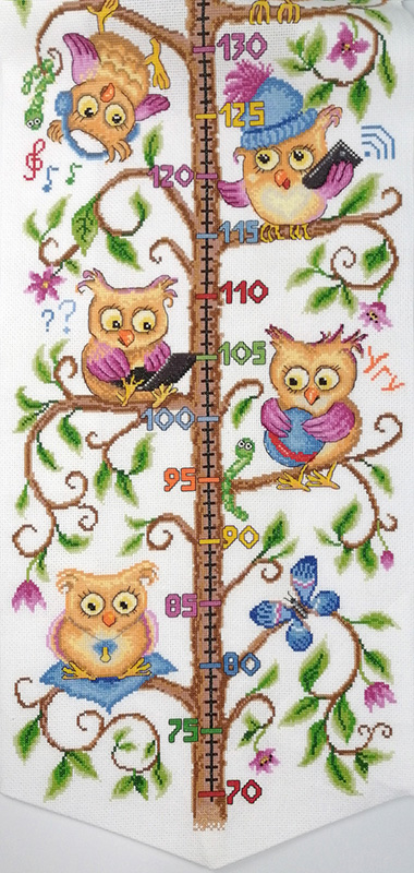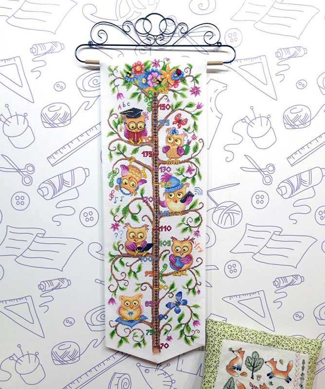 На цветущем дереве сидят совята. Каждый совенок - ребенок забавный, непоседливый и по- своему очаровательный. Вышивка яркая и красочная и будет привлекать внимание любого ребенка. Отшитый ростомер прикрепляется к стене на уровне 70 см от пола и его можно подвесить на хангере.