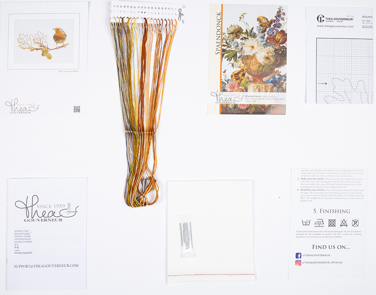 Наборы Thea Gouverneur  укомплектованы качественными материалами, такими как мулине DMC из 100% хлопка и разные виды тканей для вышивания производства Zweigart. Наборы обозначенные буквой А после номера содержат в составе канву Aida, если в артикуле есть обозначение .05 – то этот набор укомплектован канвой Aida чёрного цвета. Также в ассортименте есть наборы на 100% льне и канве Jobelan. Черно-белые схемы тщательно прорабатываются вручную. Используется богатая цветовая палитра ниток, но в ассортименте компании есть и монохромные дизайны. Нитки разобраны по символам и закреплены на органайзере. Стрелка на бумажном органайзере указывает вверх, определяя правильность чтения символов.