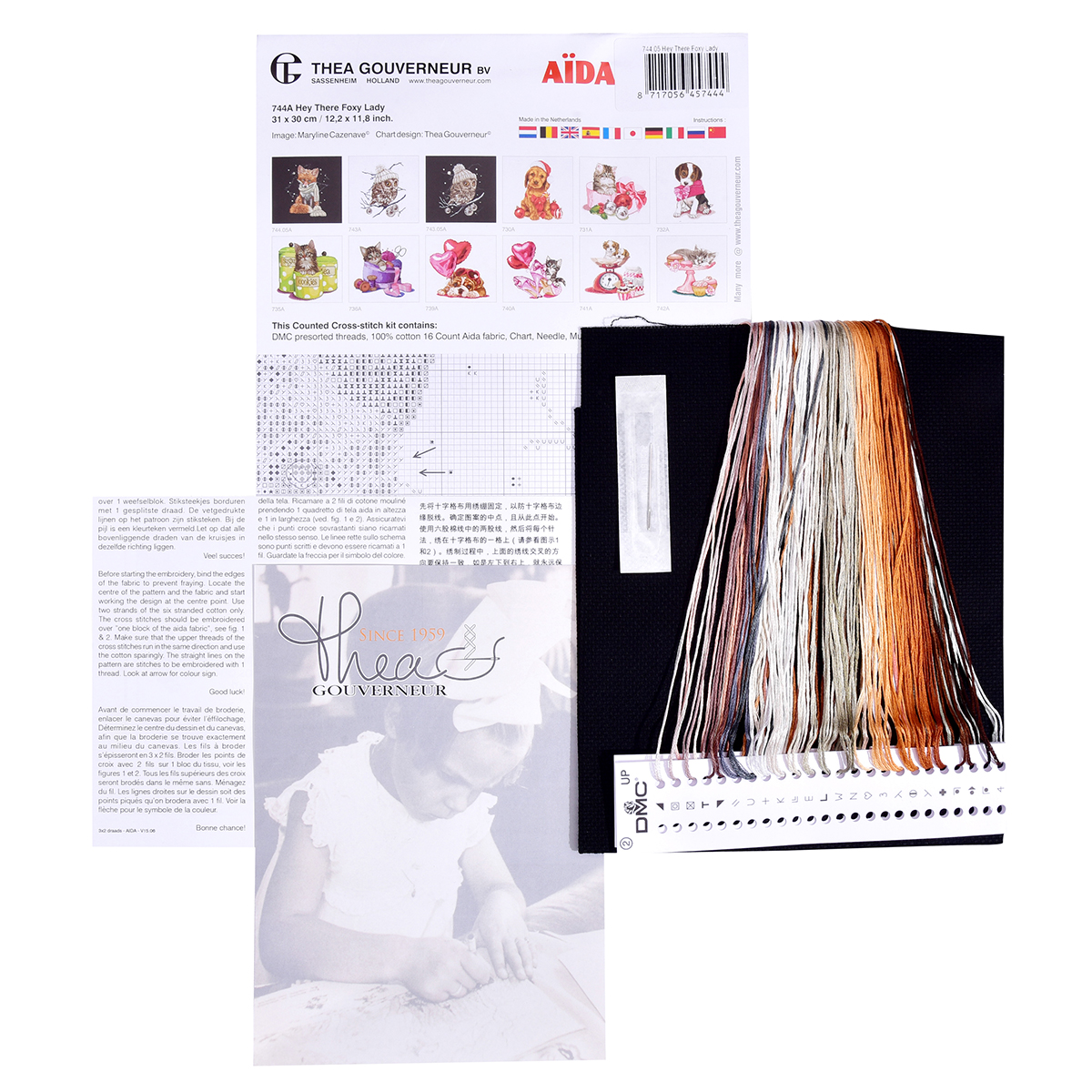 Наборы Thea Gouverneur укомплектованы качественными материалами, такими как мулине DMC из 100% хлопка и разные виды тканей для вышивания производства Zweigart. Наборы обозначенные буквой А после номера содержат в составе канву Aida, если в артикуле есть обозначение .05 – то этот набор укомплектован канвой Aida чёрного цвета. Также в ассортименте есть наборы на 100% льне и канве Jobelan. Черно-белые схемы тщательно прорабатываются вручную. Используется богатая цветовая палитра ниток, но в ассортименте компании есть и монохромные дизайны. Нитки разобраны по символам и закреплены на органайзере. Стрелка на бумажном органайзере указывает вверх, определяя правильность чтения символов.