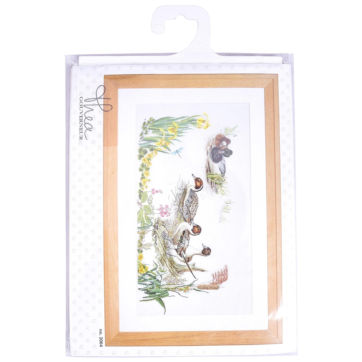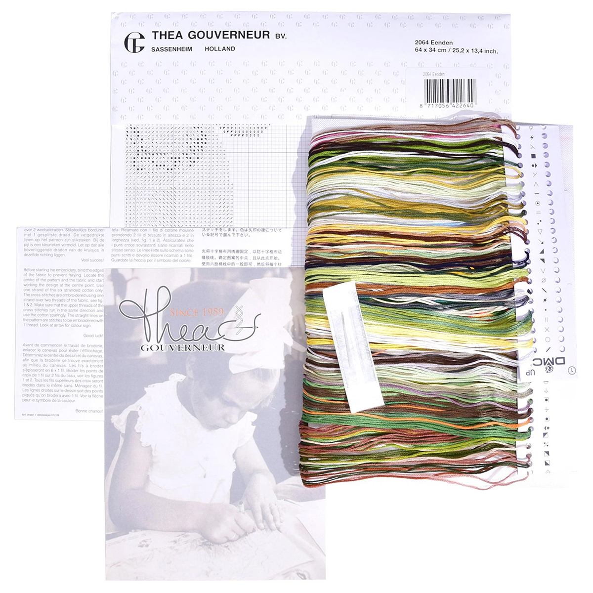 Наборы Thea Gouverneur укомплектованы качественными материалами, такими как мулине DMC из 100% хлопка и разные виды тканей для вышивания производства Zweigart. Наборы обозначенные буквой А после номера содержат в составе канву Aida, если в артикуле есть обозначение .05 – то этот набор укомплектован канвой Aida чёрного цвета. Также в ассортименте есть наборы на 100% льне и канве Jobelan. Черно-белые схемы тщательно прорабатываются вручную. Используется богатая цветовая палитра ниток, но в ассортименте компании есть и монохромные дизайны. Нитки разобраны по символам и закреплены на органайзере. Стрелка на бумажном органайзере указывает вверх, определяя правильность чтения символов.