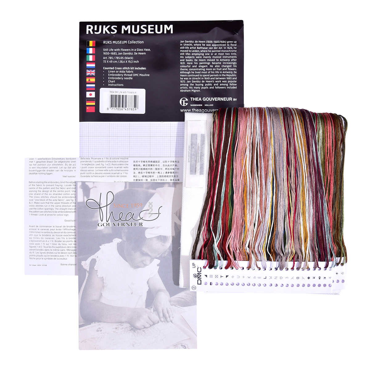 Наборы Thea Gouverneur укомплектованы качественными материалами, такими как мулине DMC из 100% хлопка и разные виды тканей для вышивания производства Zweigart. Наборы обозначенные буквой А после номера содержат в составе канву Aida, если в артикуле есть обозначение .05 – то этот набор укомплектован канвой Aida чёрного цвета. Также в ассортименте есть наборы на 100% льне и канве Jobelan. Черно-белые схемы тщательно прорабатываются вручную. Используется богатая цветовая палитра ниток, но в ассортименте компании есть и монохромные дизайны. Нитки разобраны по символам и закреплены на органайзере. Стрелка на бумажном органайзере указывает вверх, определяя правильность чтения символов.