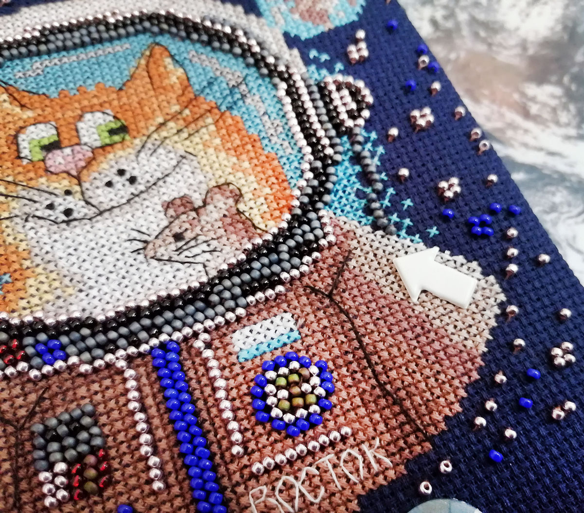 Канва Aida 14 ct темно-синяя, мулине Finca 12 цв., бисер, декоративные элементы, игла, инструкция, схема черно-белая