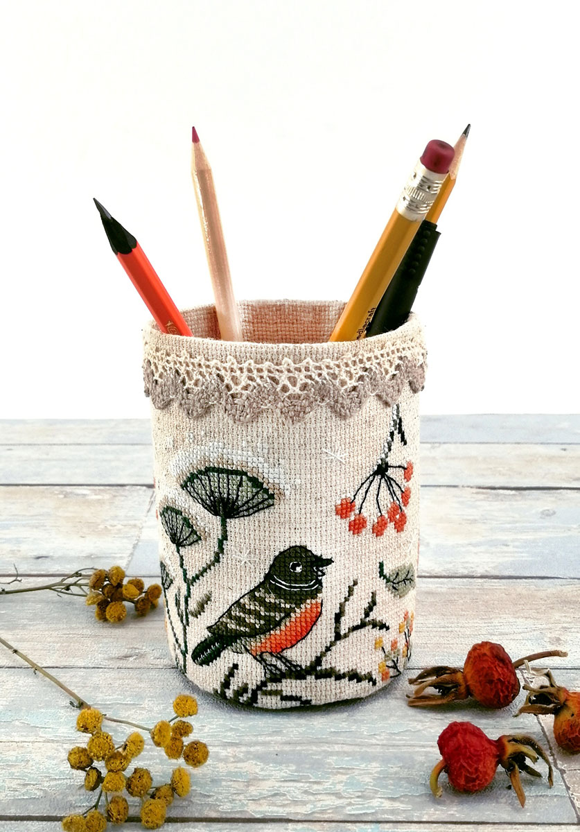 Фольклорная тематика по-своему притягательна. В нашей новой карандашнице очаровательные птички на фоне присыпанных снегом сухоцветов в период предзимья. Такая интересная и нужная вещь получится из набора "Птички".