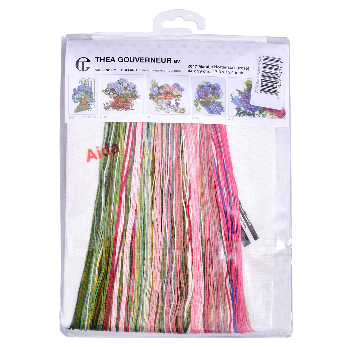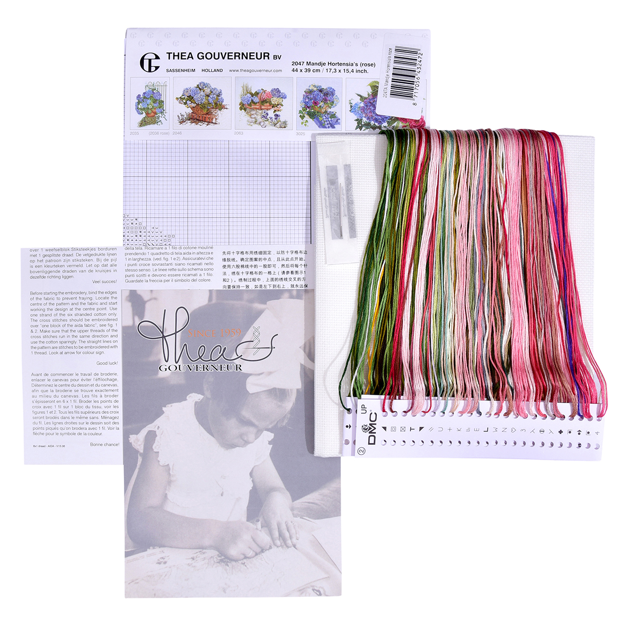 Наборы Thea Gouverneur укомплектованы качественными материалами, такими как мулине DMC из 100% хлопка и разные виды тканей для вышивания производства Zweigart. Наборы обозначенные буквой А после номера содержат в составе канву Aida, если в артикуле есть обозначение .05 – то этот набор укомплектован канвой Aida чёрного цвета. Также в ассортименте есть наборы на 100% льне и канве Jobelan. Черно-белые схемы тщательно прорабатываются вручную. Используется богатая цветовая палитра ниток, но в ассортименте компании есть и монохромные дизайны. Нитки разобраны по символам и закреплены на органайзере. Стрелка на бумажном органайзере указывает вверх, определяя правильность чтения символов.