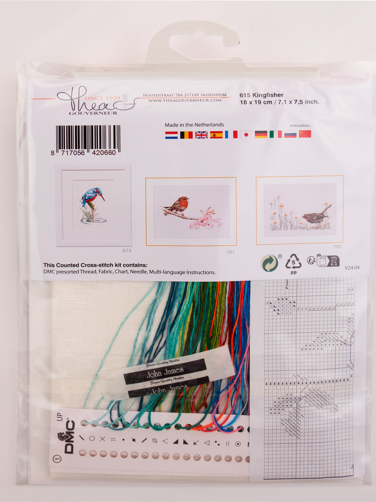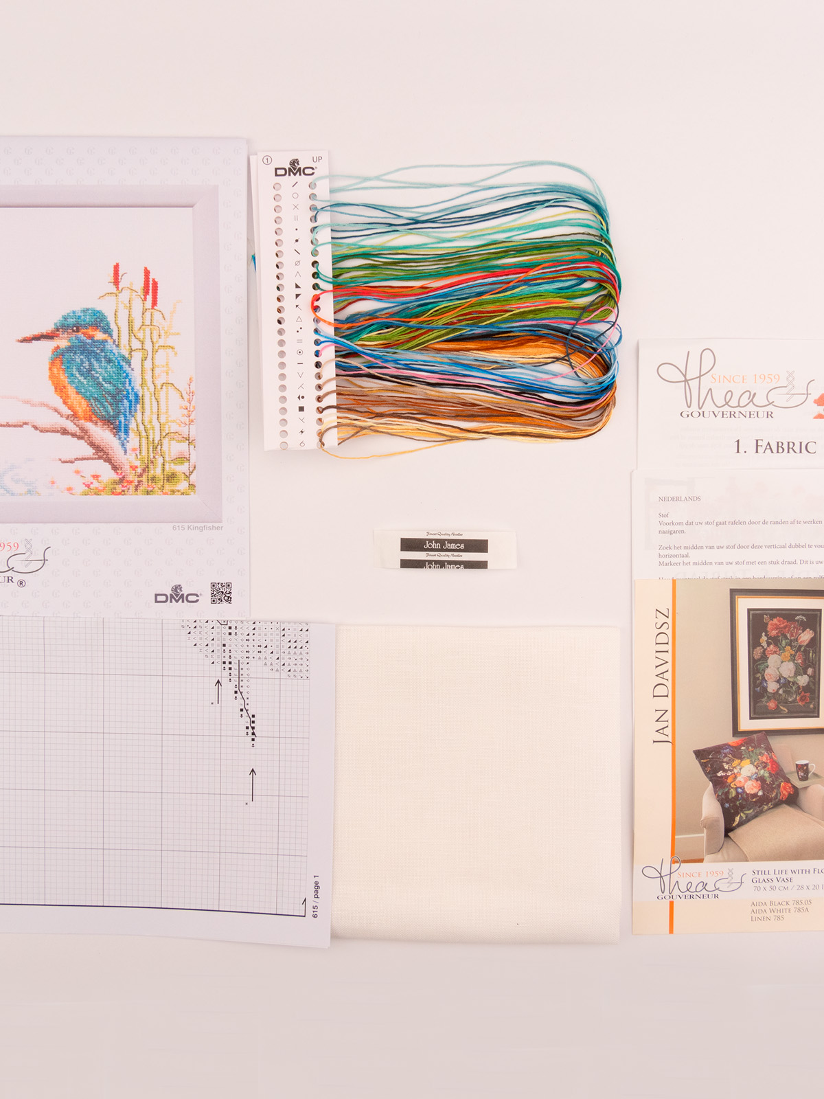 Наборы Thea Gouverneur  укомплектованы качественными материалами, такими как мулине DMC из 100% хлопка и разные виды тканей для вышивания производства Zweigart. Наборы обозначенные буквой А после номера содержат в составе канву Aida, если в артикуле есть обозначение .05 – то этот набор укомплектован канвой Aida чёрного цвета. Также в ассортименте есть наборы на 100% льне и канве Jobelan. Черно-белые схемы тщательно прорабатываются вручную. Используется богатая цветовая палитра ниток, но в ассортименте компании есть и монохромные дизайны. Нитки разобраны по символам и закреплены на органайзере. Стрелка на бумажном органайзере указывает вверх, определяя правильность чтения символов.