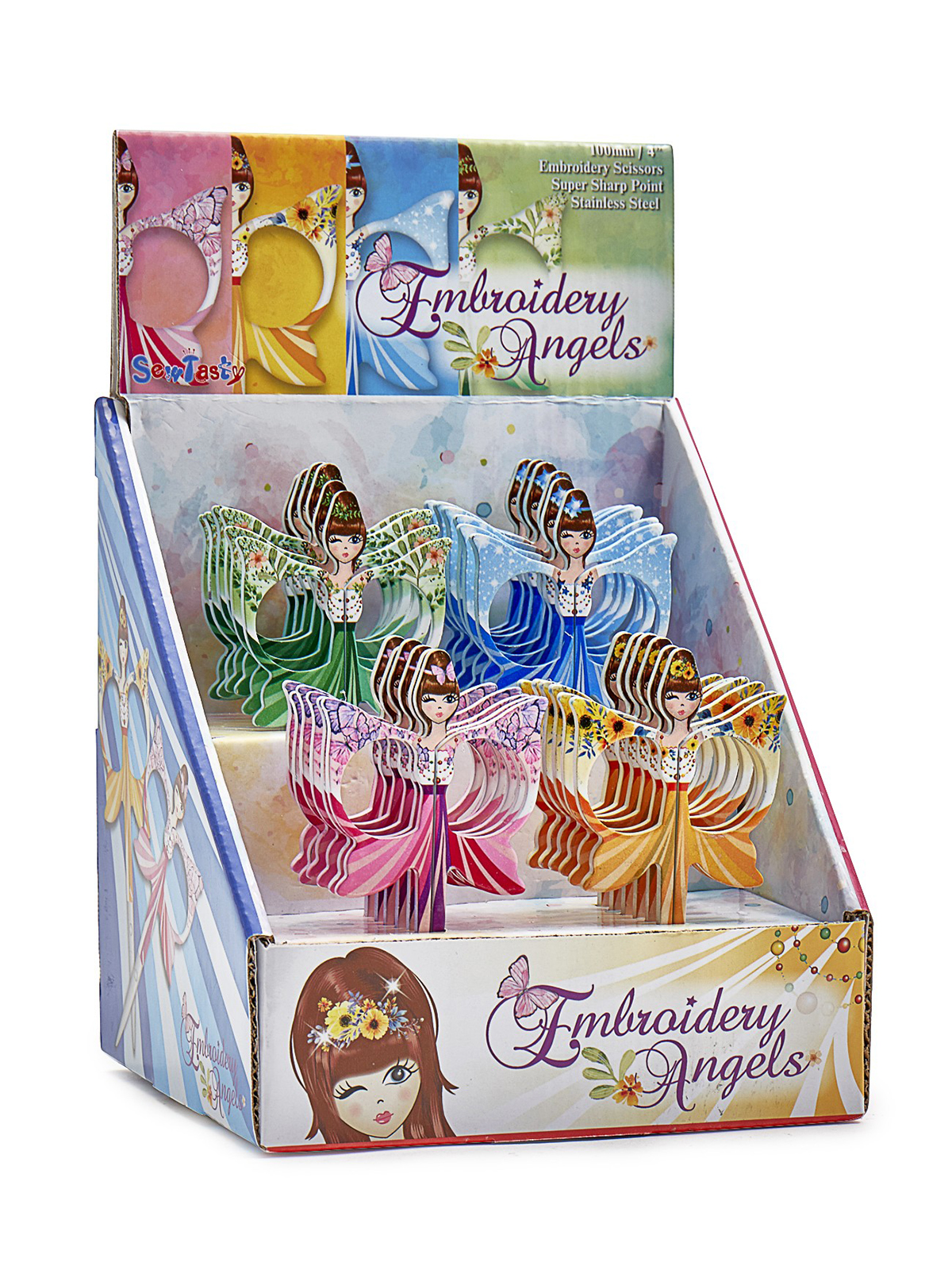 Набор ножниц для вышивания "Ангелочки" 10 см, в прикассовом стенде. Ножницы для вышивания 100 мм. Острый и тонкий наконечник для точной резки. Лезвия из нержавеющей стали. Представлен на цветном бумажном дисплее. Цвета: синий, зелёный, розовый, жёлтый. Размеры изделия: 15 x 13 x 15 см. Общий вес изделия: 730 г.