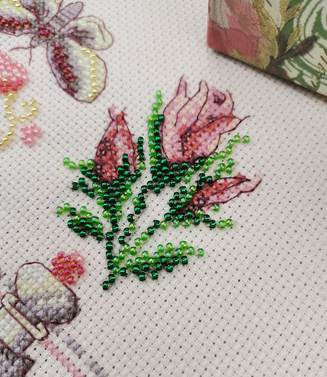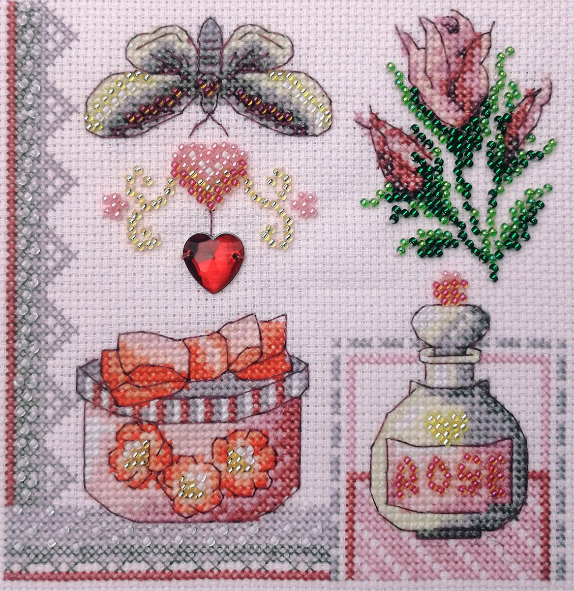 канва Aida 14 ct розовая, мулине Finca 13 цв., декорат элемент, пуговица, бисер, игла, инструкция, схема черно-белая