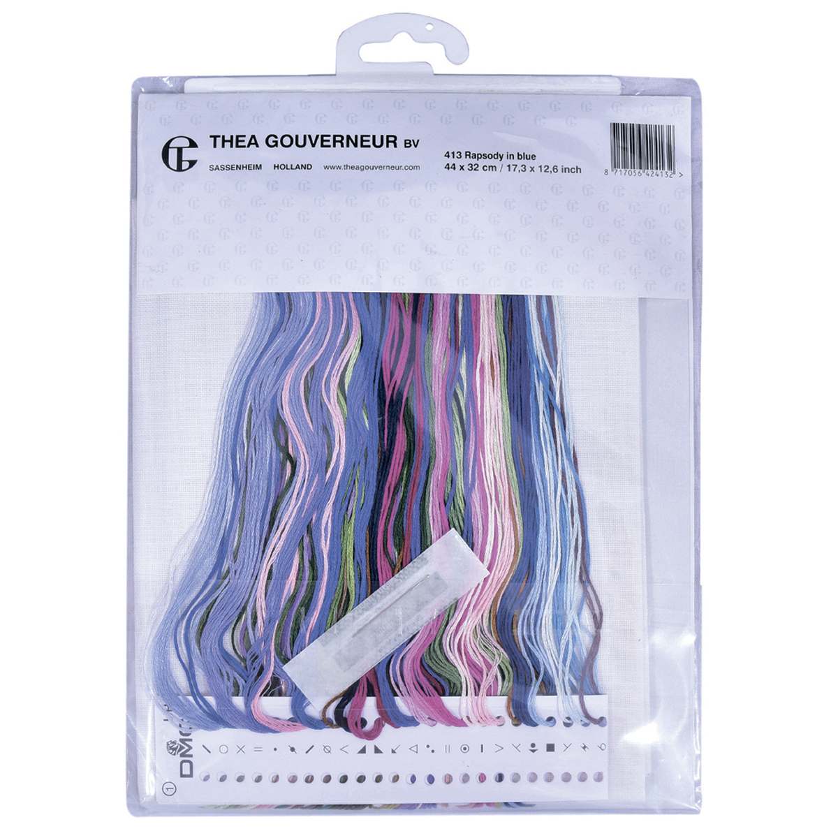 Наборы Thea Gouverneur укомплектованы качественными материалами, такими как мулине DMC из 100% хлопка и разные виды тканей для вышивания производства Zweigart. Наборы обозначенные буквой А после номера содержат в составе канву Aida, если в артикуле есть обозначение .05 – то этот набор укомплектован канвой Aida чёрного цвета. Также в ассортименте есть наборы на 100% льне и канве Jobelan. Черно-белые схемы тщательно прорабатываются вручную. Используется богатая цветовая палитра ниток, но в ассортименте компании есть и монохромные дизайны. Нитки разобраны по символам и закреплены на органайзере. Стрелка на бумажном органайзере указывает вверх, определяя правильность чтения символов.