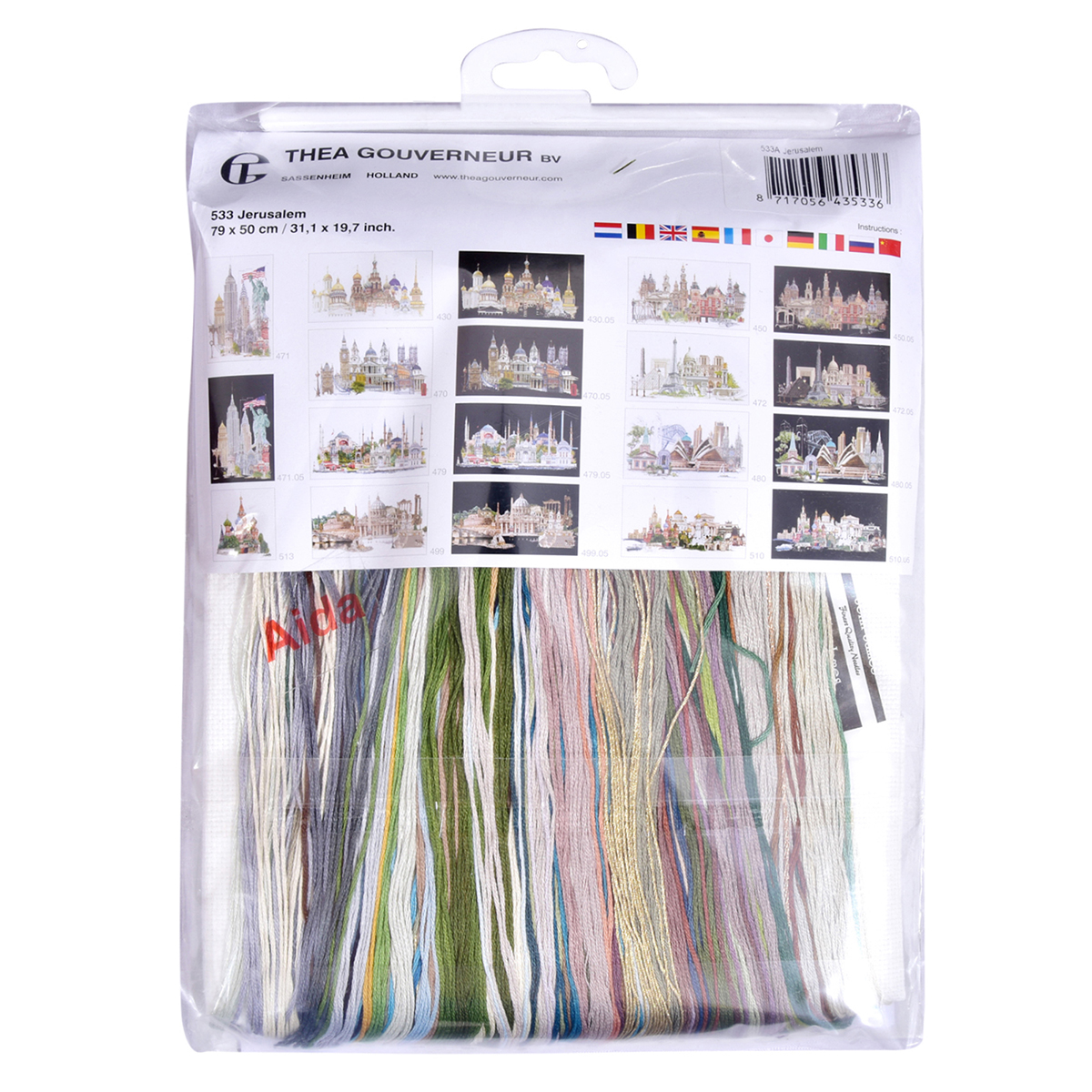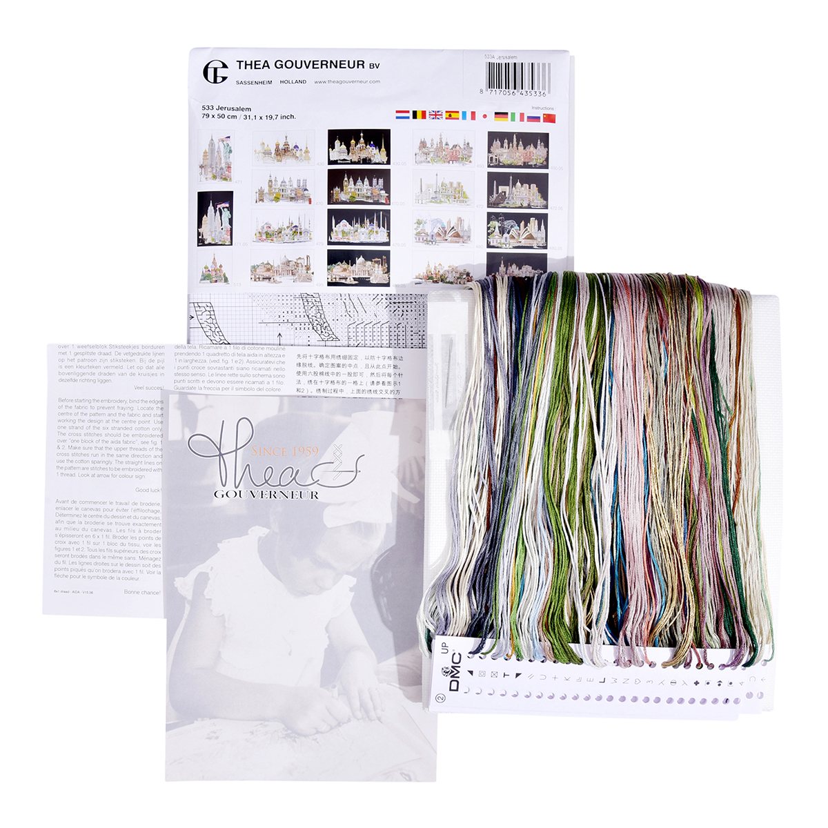 Наборы Thea Gouverneur укомплектованы качественными материалами, такими как мулине DMC из 100% хлопка и разные виды тканей для вышивания производства Zweigart. Наборы обозначенные буквой А после номера содержат в составе канву Aida, если в артикуле есть обозначение .05 – то этот набор укомплектован канвой Aida чёрного цвета. Также в ассортименте есть наборы на 100% льне и канве Jobelan. Черно-белые схемы тщательно прорабатываются вручную. Используется богатая цветовая палитра ниток, но в ассортименте компании есть и монохромные дизайны. Нитки разобраны по символам и закреплены на органайзере. Стрелка на бумажном органайзере указывает вверх, определяя правильность чтения символов.