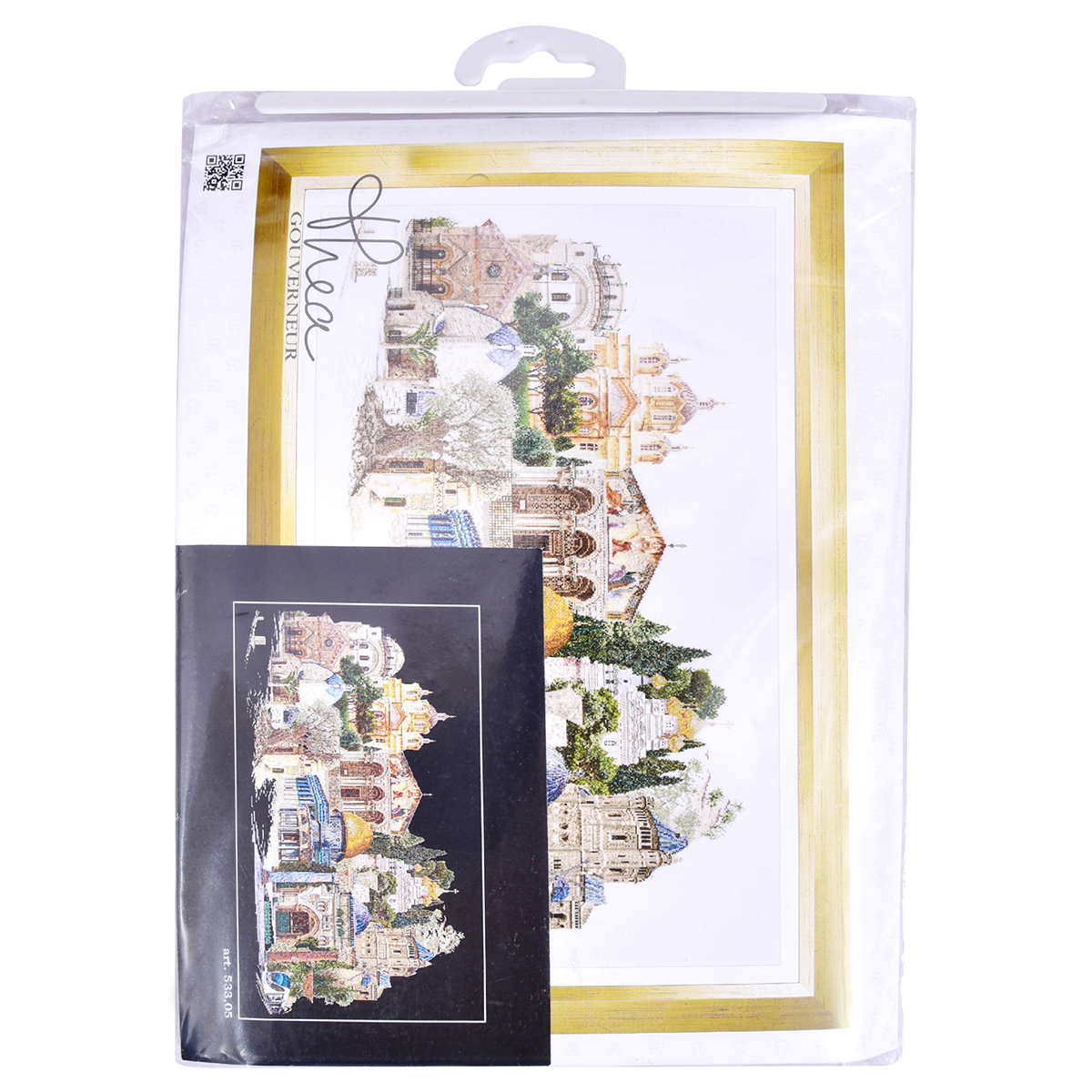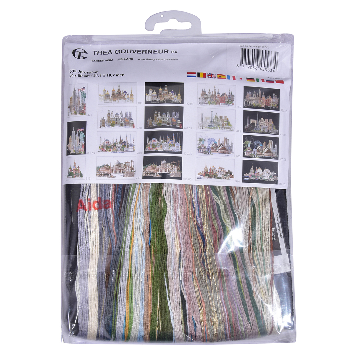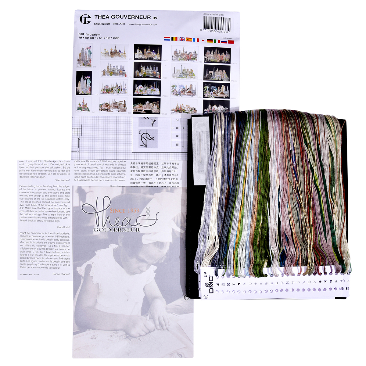 Наборы Thea Gouverneur укомплектованы качественными материалами, такими как мулине DMC из 100% хлопка и разные виды тканей для вышивания производства Zweigart. Наборы обозначенные буквой А после номера содержат в составе канву Aida, если в артикуле есть обозначение .05 – то этот набор укомплектован канвой Aida чёрного цвета. Также в ассортименте есть наборы на 100% льне и канве Jobelan. Черно-белые схемы тщательно прорабатываются вручную. Используется богатая цветовая палитра ниток, но в ассортименте компании есть и монохромные дизайны. Нитки разобраны по символам и закреплены на органайзере. Стрелка на бумажном органайзере указывает вверх, определяя правильность чтения символов.