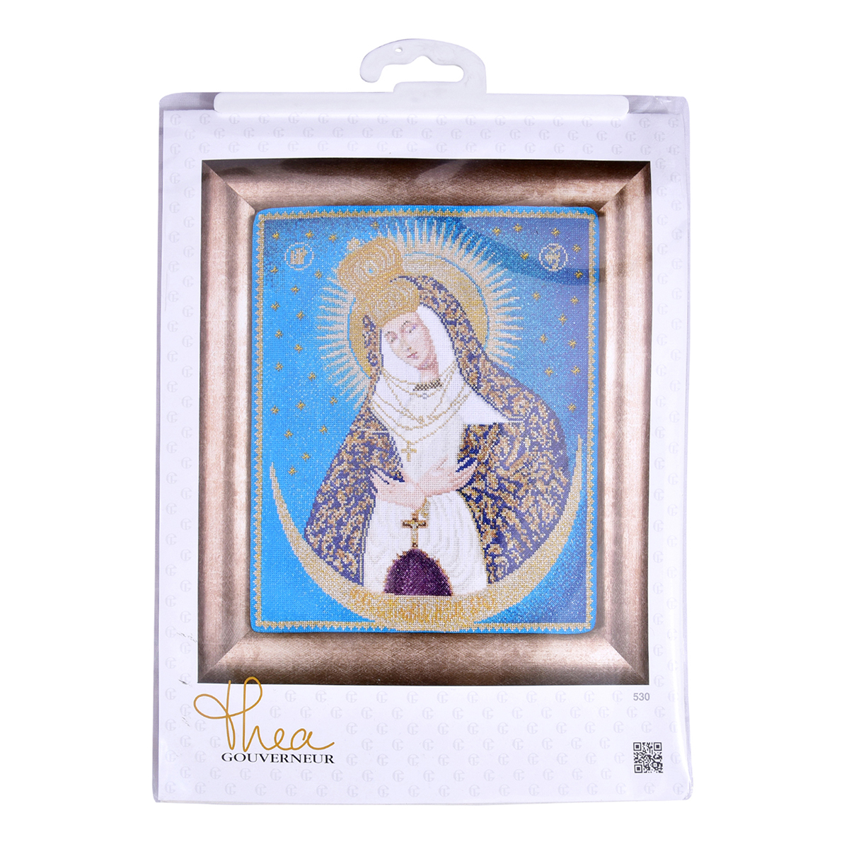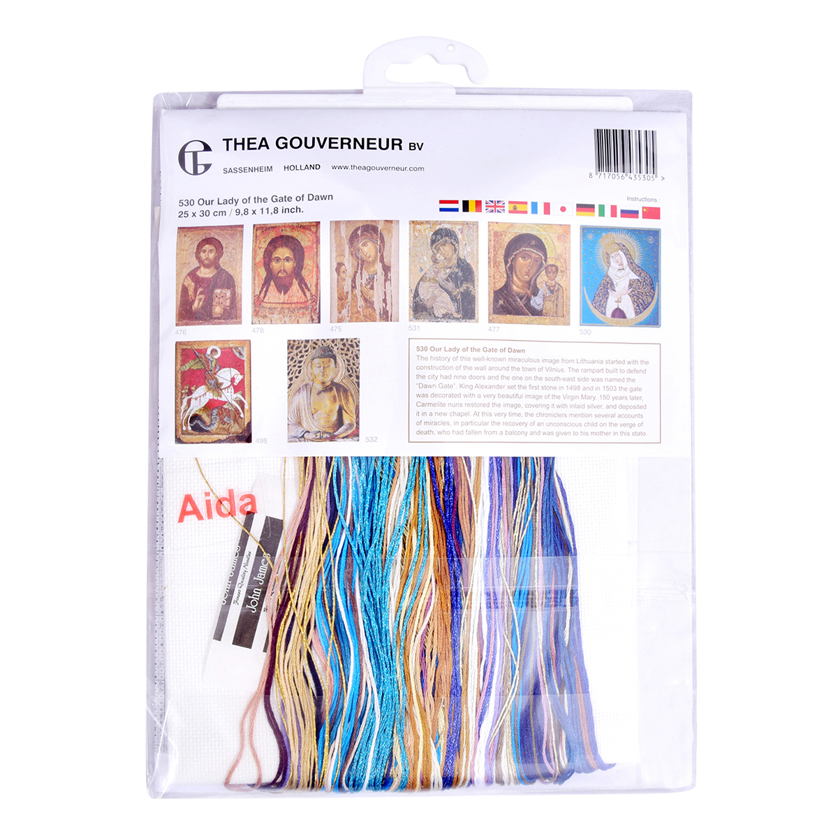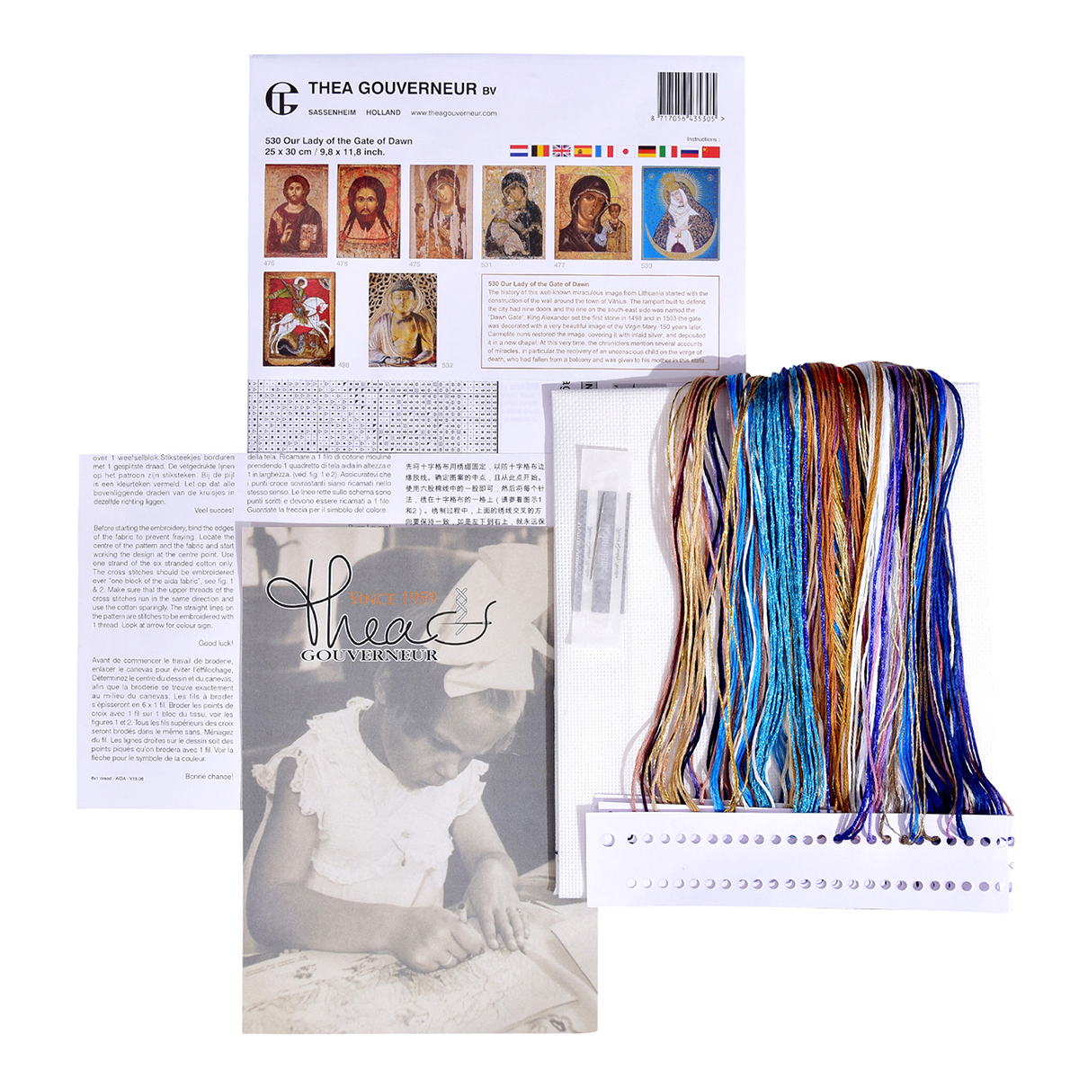 Наборы Thea Gouverneur укомплектованы качественными материалами, такими как мулине DMC из 100% хлопка и разные виды тканей для вышивания производства Zweigart. Наборы обозначенные буквой А после номера содержат в составе канву Aida, если в артикуле есть обозначение .05 – то этот набор укомплектован канвой Aida чёрного цвета. Также в ассортименте есть наборы на 100% льне и канве Jobelan. Черно-белые схемы тщательно прорабатываются вручную. Используется богатая цветовая палитра ниток, но в ассортименте компании есть и монохромные дизайны. Нитки разобраны по символам и закреплены на органайзере. Стрелка на бумажном органайзере указывает вверх, определяя правильность чтения символов.