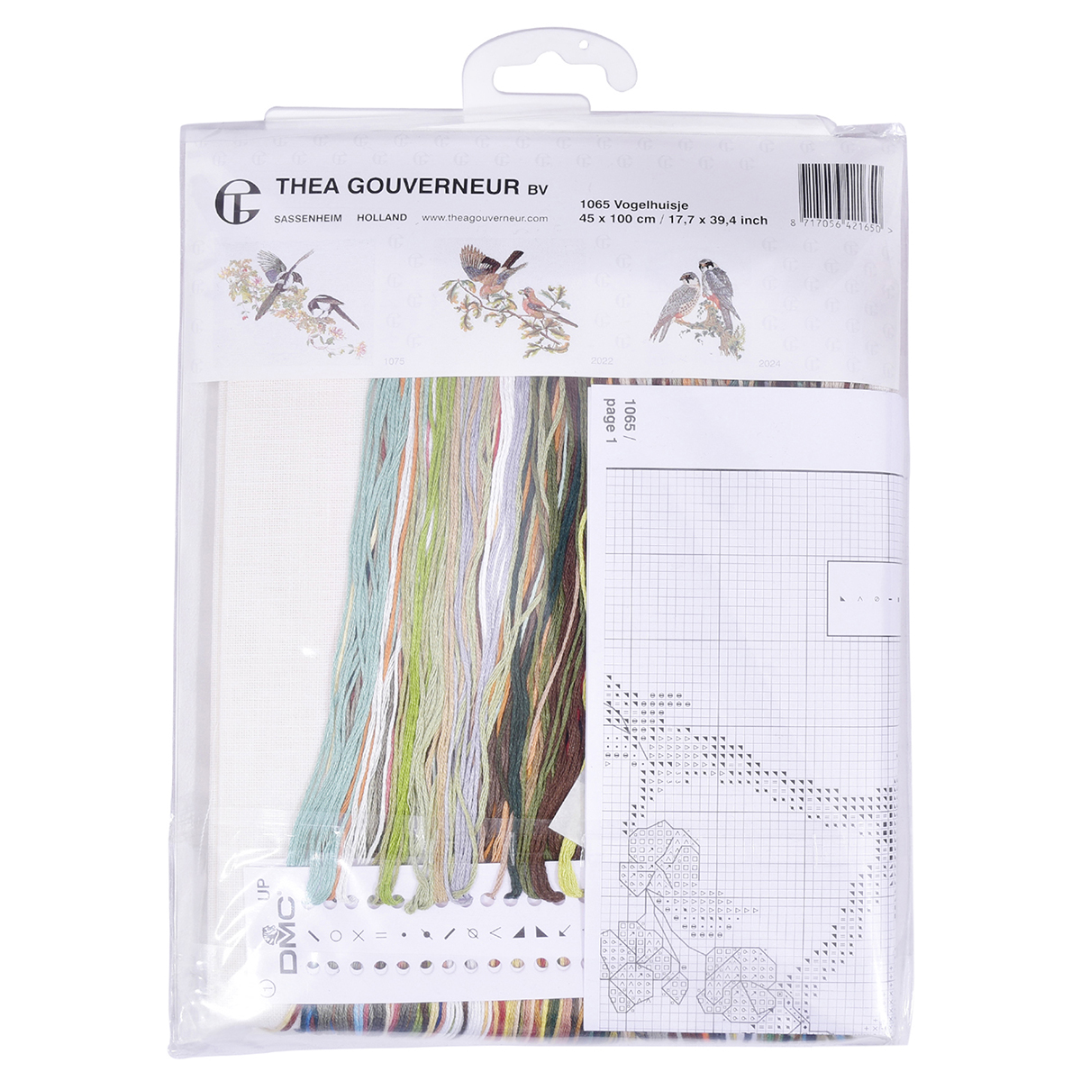 Наборы Thea Gouverneur укомплектованы качественными материалами, такими как мулине DMC из 100% хлопка и разные виды тканей для вышивания производства Zweigart. Наборы обозначенные буквой А после номера содержат в составе канву Aida, если в артикуле есть обозначение .05 – то этот набор укомплектован канвой Aida чёрного цвета. Также в ассортименте есть наборы на 100% льне и канве Jobelan. Черно-белые схемы тщательно прорабатываются вручную. Используется богатая цветовая палитра ниток, но в ассортименте компании есть и монохромные дизайны. Нитки разобраны по символам и закреплены на органайзере. Стрелка на бумажном органайзере указывает вверх, определяя правильность чтения символов.