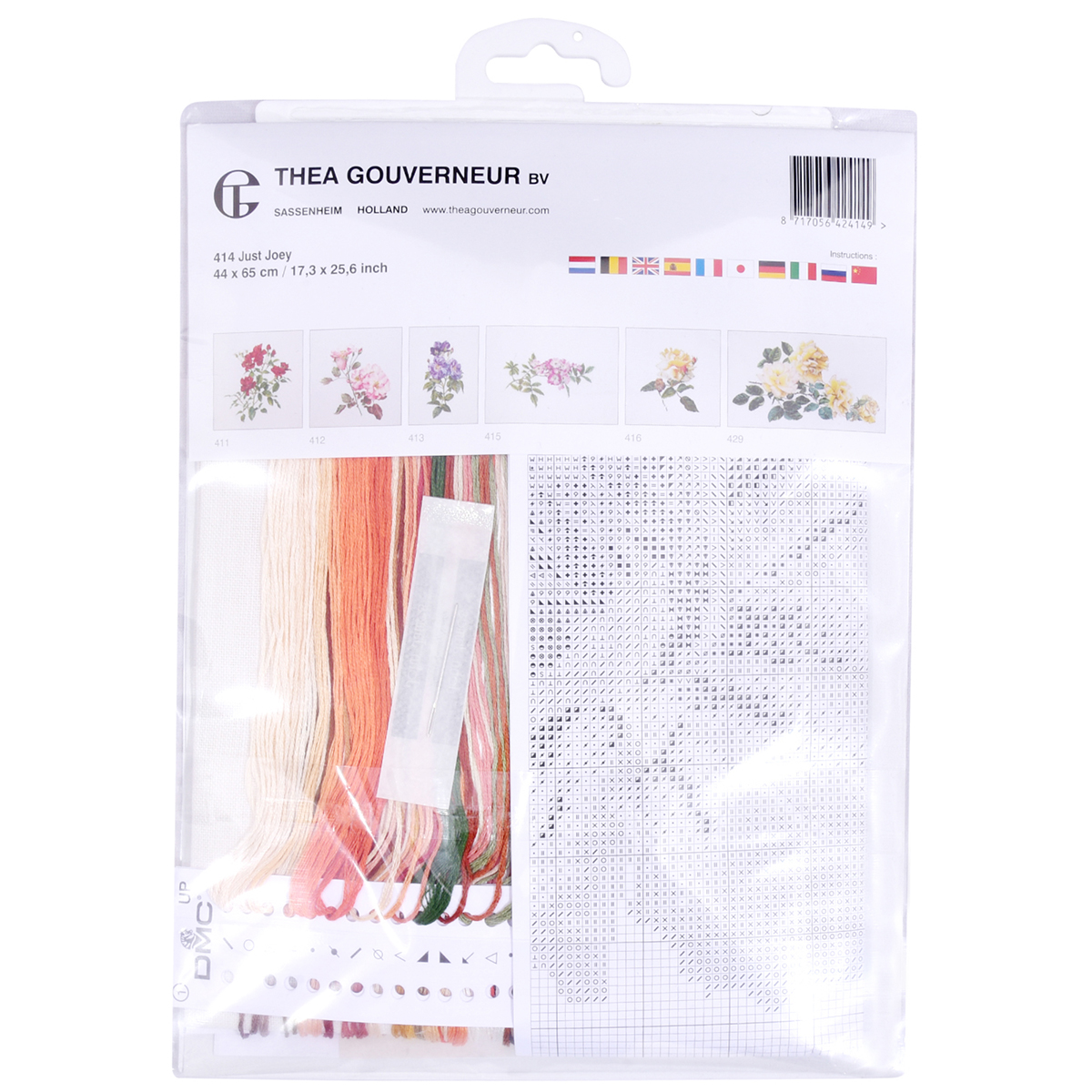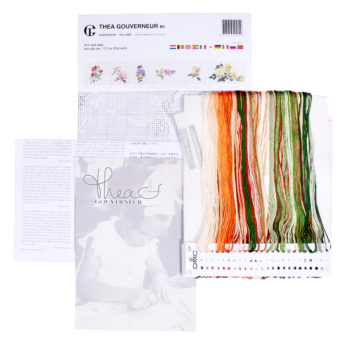Наборы Thea Gouverneur укомплектованы качественными материалами, такими как мулине DMC из 100% хлопка и разные виды тканей для вышивания производства Zweigart. Наборы обозначенные буквой А после номера содержат в составе канву Aida, если в артикуле есть обозначение .05 – то этот набор укомплектован канвой Aida чёрного цвета. Также в ассортименте есть наборы на 100% льне и канве Jobelan. Черно-белые схемы тщательно прорабатываются вручную. Используется богатая цветовая палитра ниток, но в ассортименте компании есть и монохромные дизайны. Нитки разобраны по символам и закреплены на органайзере. Стрелка на бумажном органайзере указывает вверх, определяя правильность чтения символов.