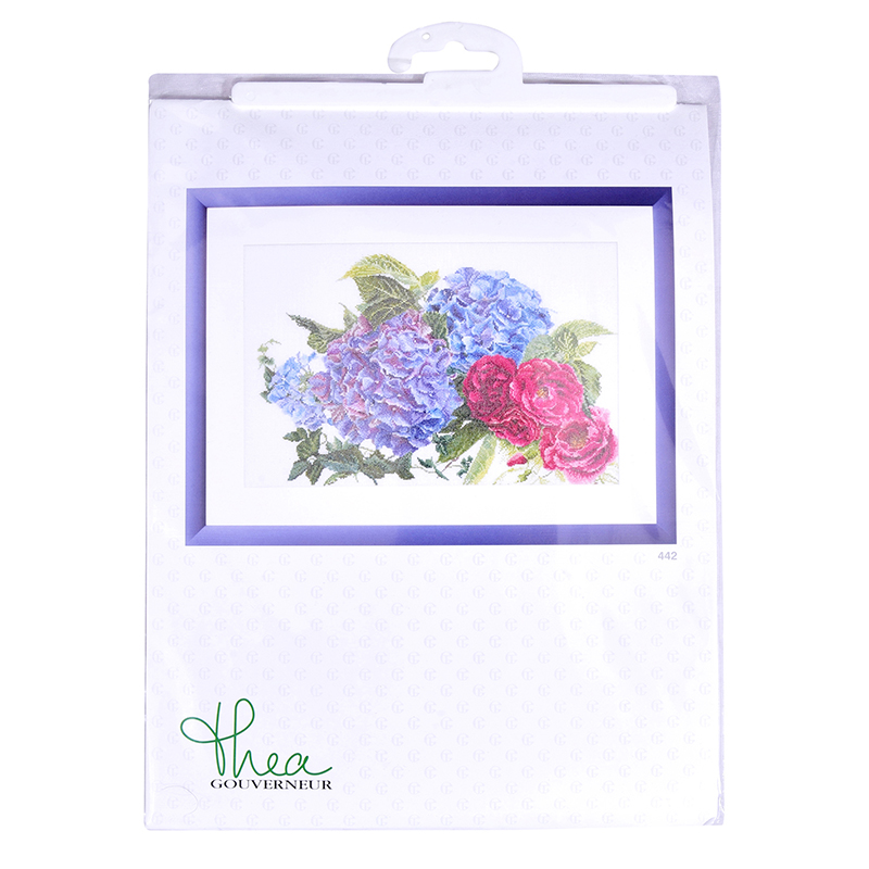 Наборы Thea Gouverneur укомплектованы качественными материалами, такими как мулине DMC из 100% хлопка и разные виды тканей для вышивания производства Zweigart. Наборы обозначенные буквой А после номера содержат в составе канву Aida, если в артикуле есть обозначение .05 – то этот набор укомплектован канвой Aida чёрного цвета. Также в ассортименте есть наборы на 100% льне и канве Jobelan. Черно-белые схемы тщательно прорабатываются вручную. Используется богатая цветовая палитра ниток, но в ассортименте компании есть и монохромные дизайны. Нитки разобраны по символам и закреплены на органайзере. Стрелка на бумажном органайзере указывает вверх, определяя правильность чтения символов.