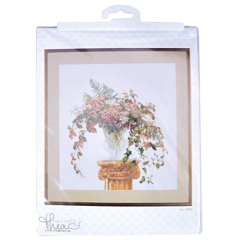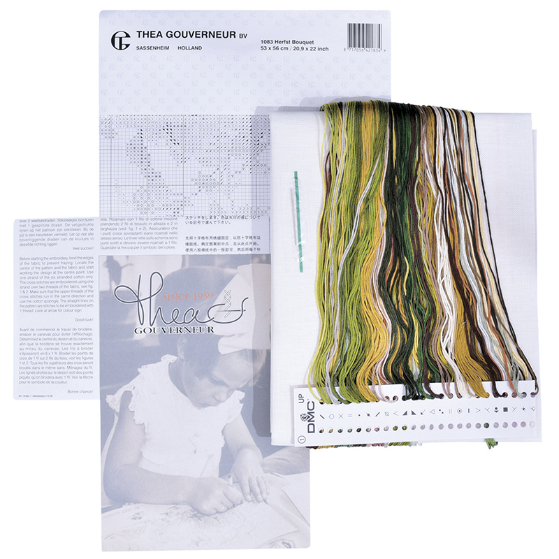Наборы Thea Gouverneur укомплектованы качественными материалами, такими как мулине DMC из 100% хлопка и разные виды тканей для вышивания производства Zweigart. Наборы обозначенные буквой А после номера содержат в составе канву Aida, если в артикуле есть обозначение .05 – то этот набор укомплектован канвой Aida чёрного цвета. Также в ассортименте есть наборы на 100% льне и канве Jobelan. Черно-белые схемы тщательно прорабатываются вручную. Используется богатая цветовая палитра ниток, но в ассортименте компании есть и монохромные дизайны. Нитки разобраны по символам и закреплены на органайзере. Стрелка на бумажном органайзере указывает вверх, определяя правильность чтения символов.