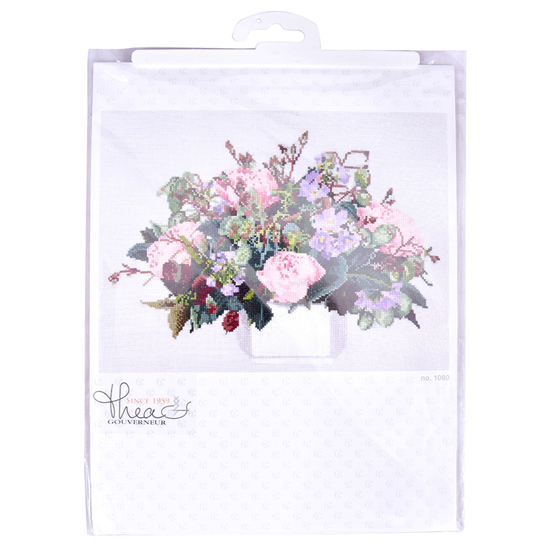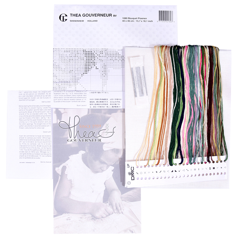 Наборы Thea Gouverneur укомплектованы качественными материалами, такими как мулине DMC из 100% хлопка и разные виды тканей для вышивания производства Zweigart. Наборы обозначенные буквой А после номера содержат в составе канву Aida, если в артикуле есть обозначение .05 – то этот набор укомплектован канвой Aida чёрного цвета. Также в ассортименте есть наборы на 100% льне и канве Jobelan. Черно-белые схемы тщательно прорабатываются вручную. Используется богатая цветовая палитра ниток, но в ассортименте компании есть и монохромные дизайны. Нитки разобраны по символам и закреплены на органайзере. Стрелка на бумажном органайзере указывает вверх, определяя правильность чтения символов.
