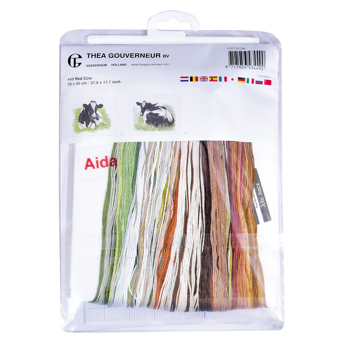 Наборы Thea Gouverneur укомплектованы качественными материалами, такими как мулине DMC из 100% хлопка и разные виды тканей для вышивания производства Zweigart. Наборы обозначенные буквой А после номера содержат в составе канву Aida, если в артикуле есть обозначение .05 – то этот набор укомплектован канвой Aida чёрного цвета. Также в ассортименте есть наборы на 100% льне и канве Jobelan. Черно-белые схемы тщательно прорабатываются вручную. Используется богатая цветовая палитра ниток, но в ассортименте компании есть и монохромные дизайны. Нитки разобраны по символам и закреплены на органайзере. Стрелка на бумажном органайзере указывает вверх, определяя правильность чтения символов.