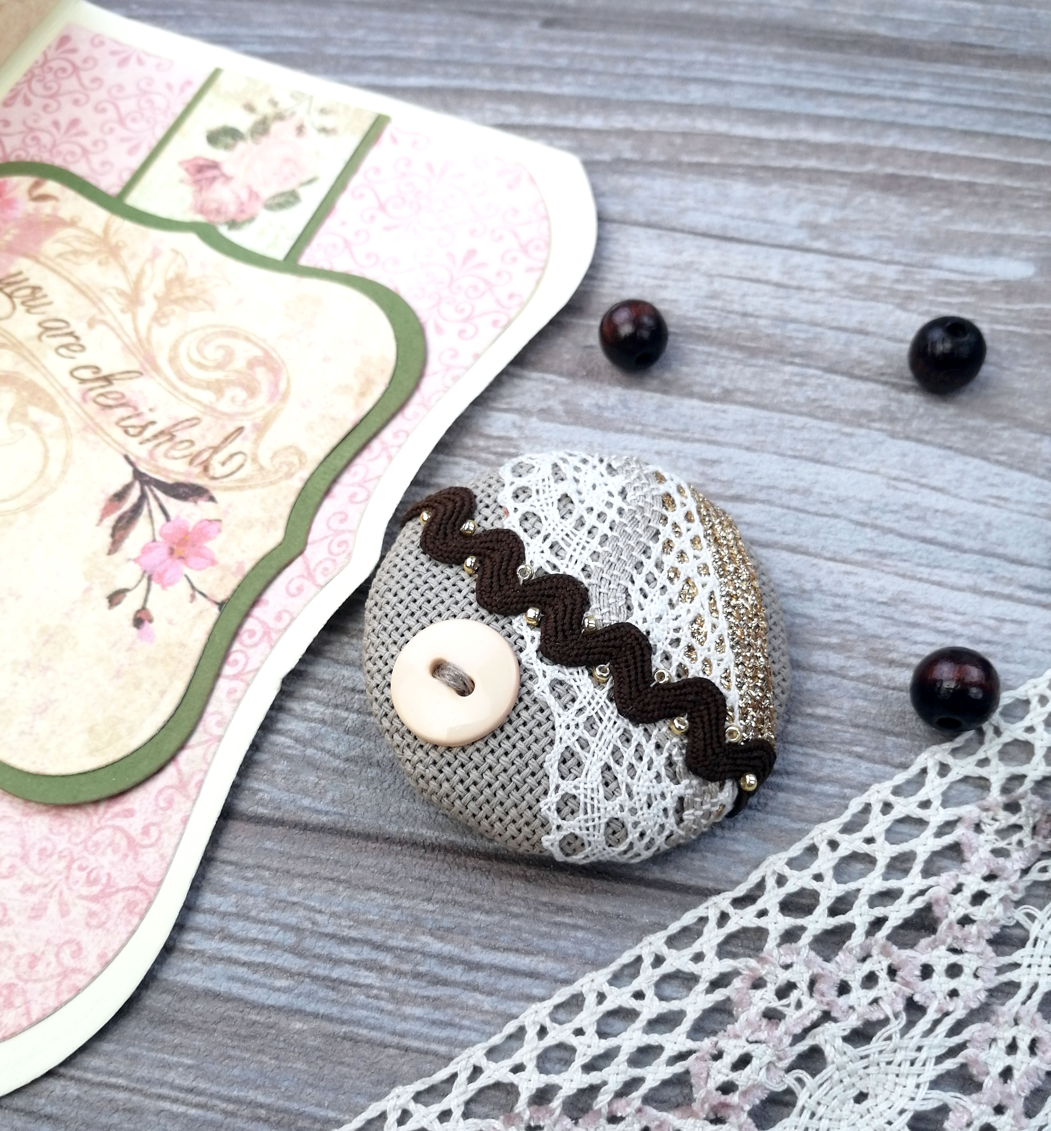 Ткань Zweigart, кружево Iemesa, тесьма, фетр Hemline, застежка Efco, нитки, пуговица, бисер, наполнитель, игла, подробная инструкция.