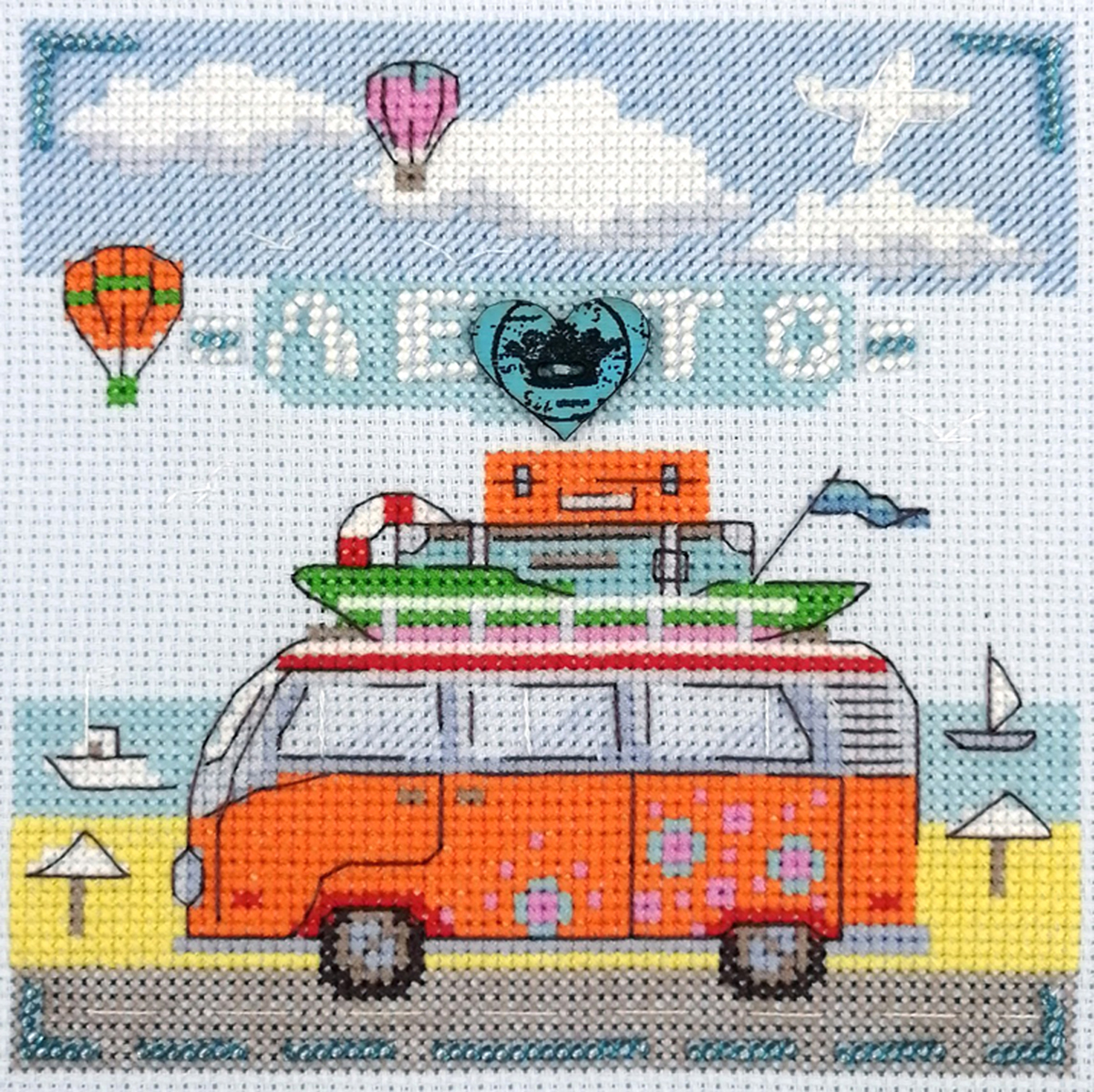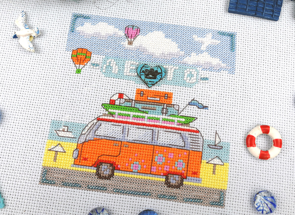 Канва Aida 14 ct светло-голубая, мулине Finca 12 цв., пуговица, бисер, игла, инструкция, схема черно-белая