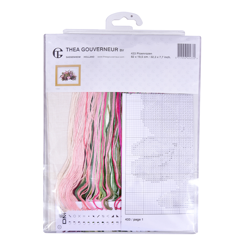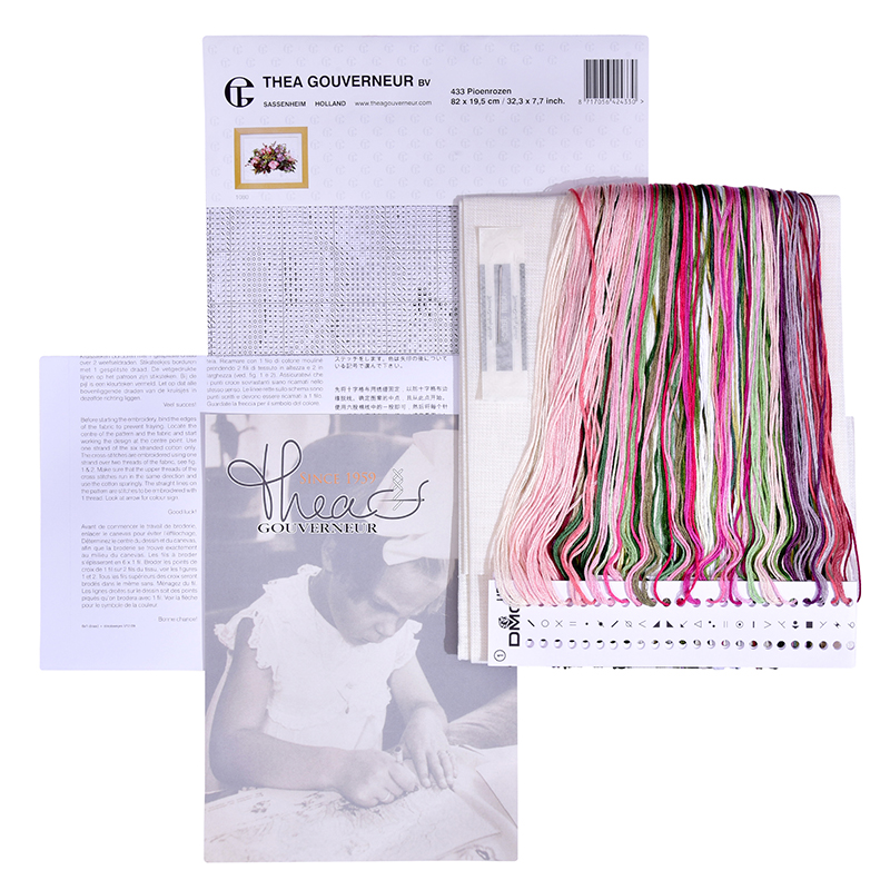 Наборы Thea Gouverneur  укомплектованы качественными материалами, такими как мулине DMC из 100% хлопка и разные виды тканей для вышивания производства Zweigart. Наборы обозначенные буквой А после номера содержат в составе канву Aida, если в артикуле есть обозначение .05 – то этот набор укомплектован канвой Aida чёрного цвета. Также в ассортименте есть наборы на 100% льне и канве Jobelan. Черно-белые схемы тщательно прорабатываются вручную. Используется богатая цветовая палитра ниток, но в ассортименте компании есть и монохромные дизайны. Нитки разобраны по символам и закреплены на органайзере. Стрелка на бумажном органайзере указывает вверх, определяя правильность чтения символов.