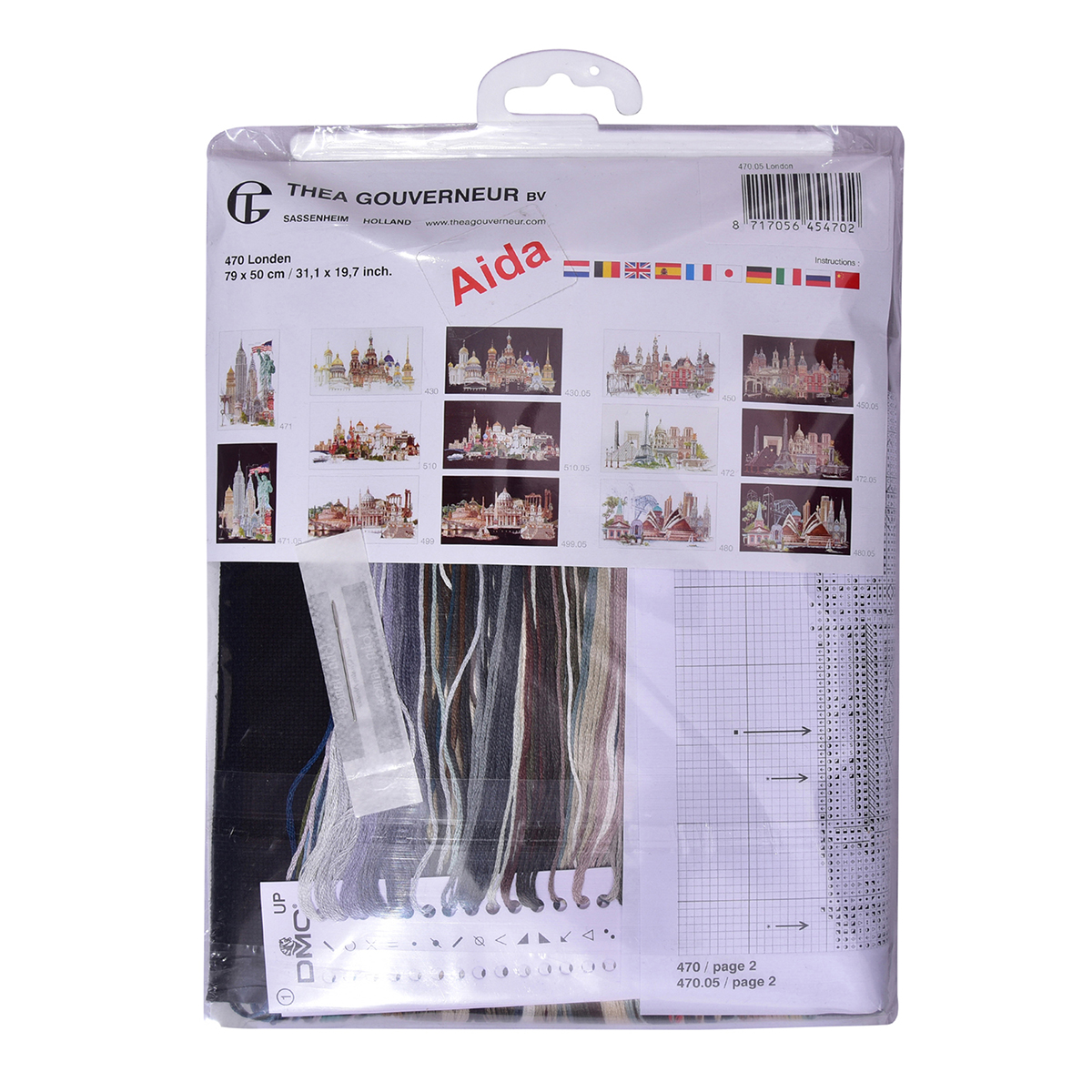 Наборы Thea Gouverneur укомплектованы качественными материалами, такими как мулине DMC из 100% хлопка и разные виды тканей для вышивания производства Zweigart. Наборы обозначенные буквой А после номера содержат в составе канву Aida, если в артикуле есть обозначение .05 – то этот набор укомплектован канвой Aida чёрного цвета. Также в ассортименте есть наборы на 100% льне и канве Jobelan. Черно-белые схемы тщательно прорабатываются вручную. Используется богатая цветовая палитра ниток, но в ассортименте компании есть и монохромные дизайны. Нитки разобраны по символам и закреплены на органайзере. Стрелка на бумажном органайзере указывает вверх, определяя правильность чтения символов.