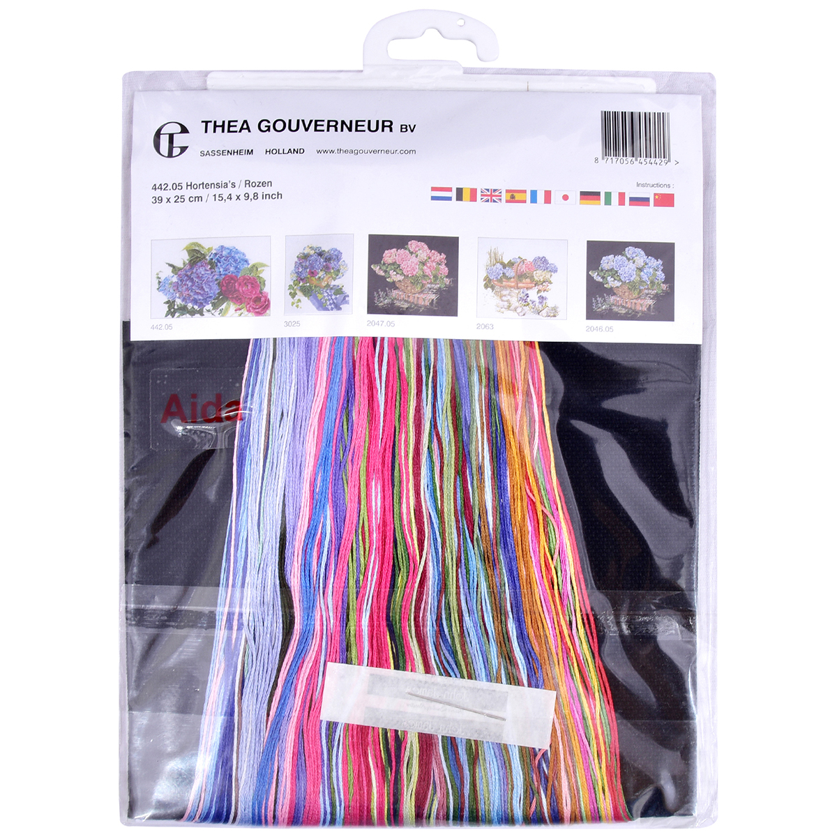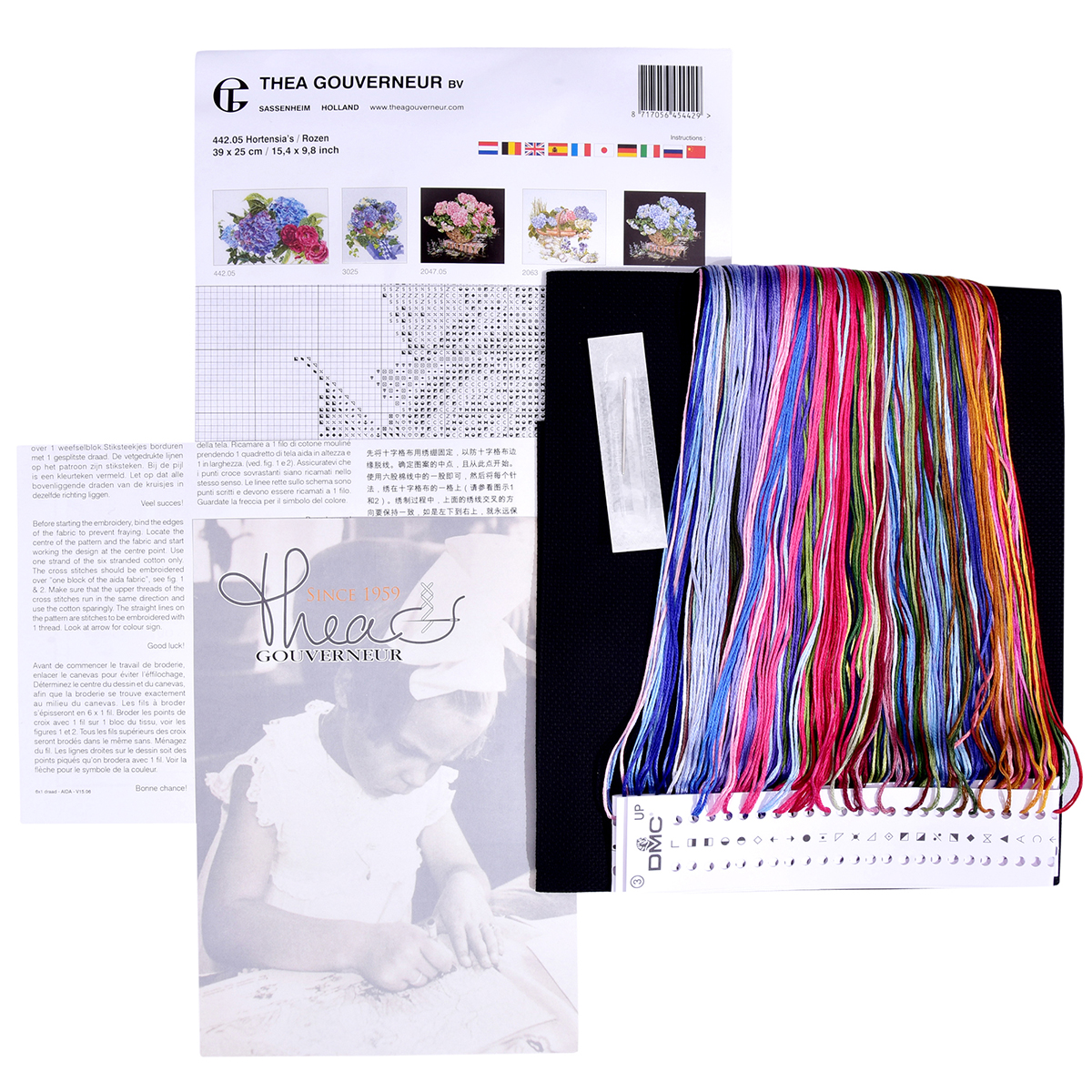 Наборы Thea Gouverneur  укомплектованы качественными материалами, такими как мулине DMC из 100% хлопка и разные виды тканей для вышивания производства Zweigart. Наборы обозначенные буквой А после номера содержат в составе канву Aida, если в артикуле есть обозначение .05 – то этот набор укомплектован канвой Aida чёрного цвета. Также в ассортименте есть наборы на 100% льне и канве Jobelan. Черно-белые схемы тщательно прорабатываются вручную. Используется богатая цветовая палитра ниток, но в ассортименте компании есть и монохромные дизайны. Нитки разобраны по символам и закреплены на органайзере. Стрелка на бумажном органайзере указывает вверх, определяя правильность чтения символов.
