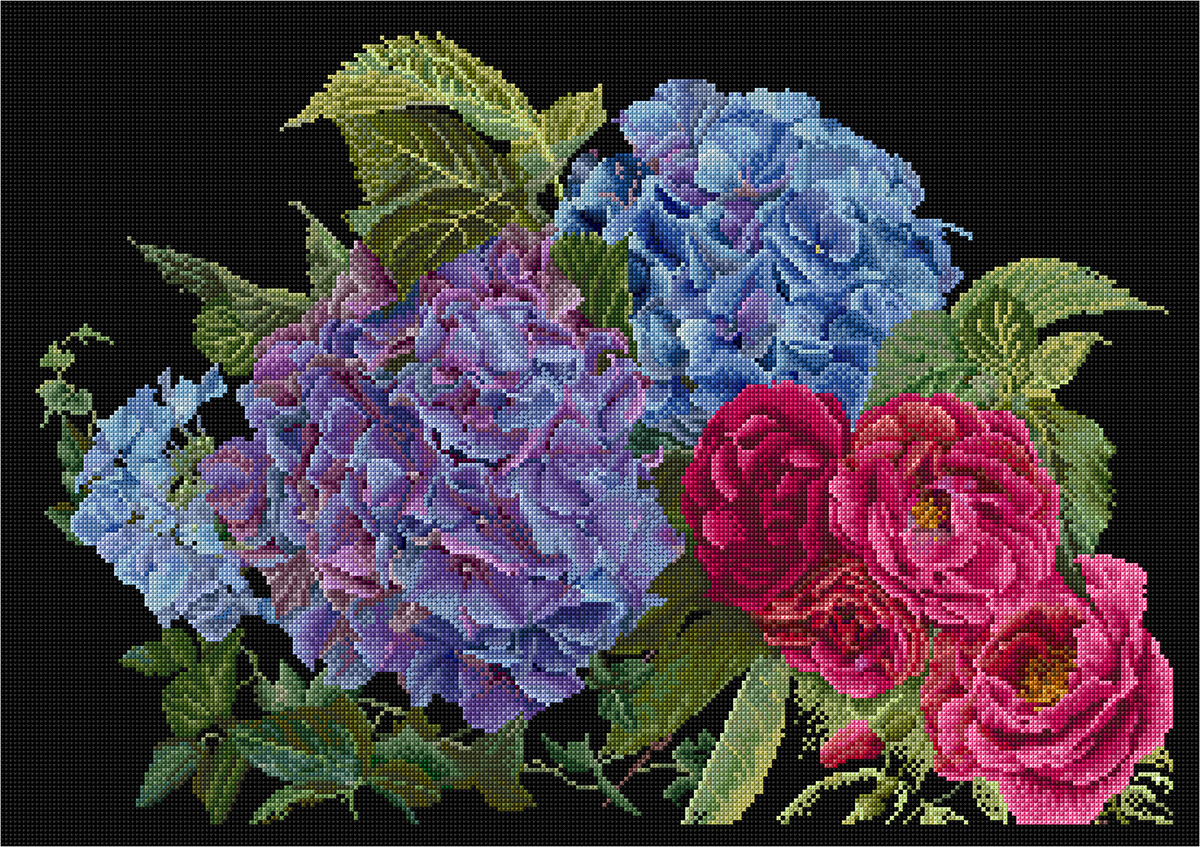 —Набор для вышивания "Гортензия и роза", канва аида (черная) 18 ct. Арт 442.05