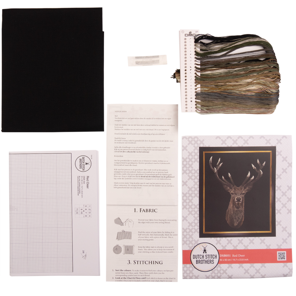 Наборы Dutch Stitch Brothers укомплектованы качественными материалами, такими как мулине DMC из 100% хлопка и разные виды тканей для вышивания производства Zweigart. Наборы обозначенные буквой А после номера содержат в составе канву Aida, если в артикуле есть обозначение .05 – то этот набор укомплектован канвой Aida чёрного цвета. Также в ассортименте есть наборы на 100% льне. Черно-белые схемы тщательно прорабатываются вручную. Используется богатая цветовая палитра ниток, но в ассортименте компании есть и монохромные дизайны. Нитки разобраны по символам и закреплены на органайзере. Стрелка на бумажном органайзере указывает вверх, определяя правильность чтения символов.
