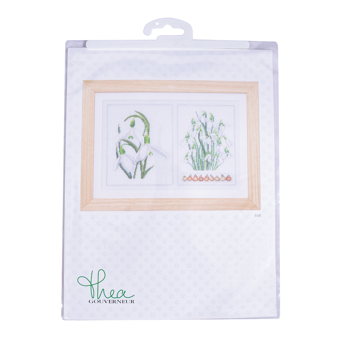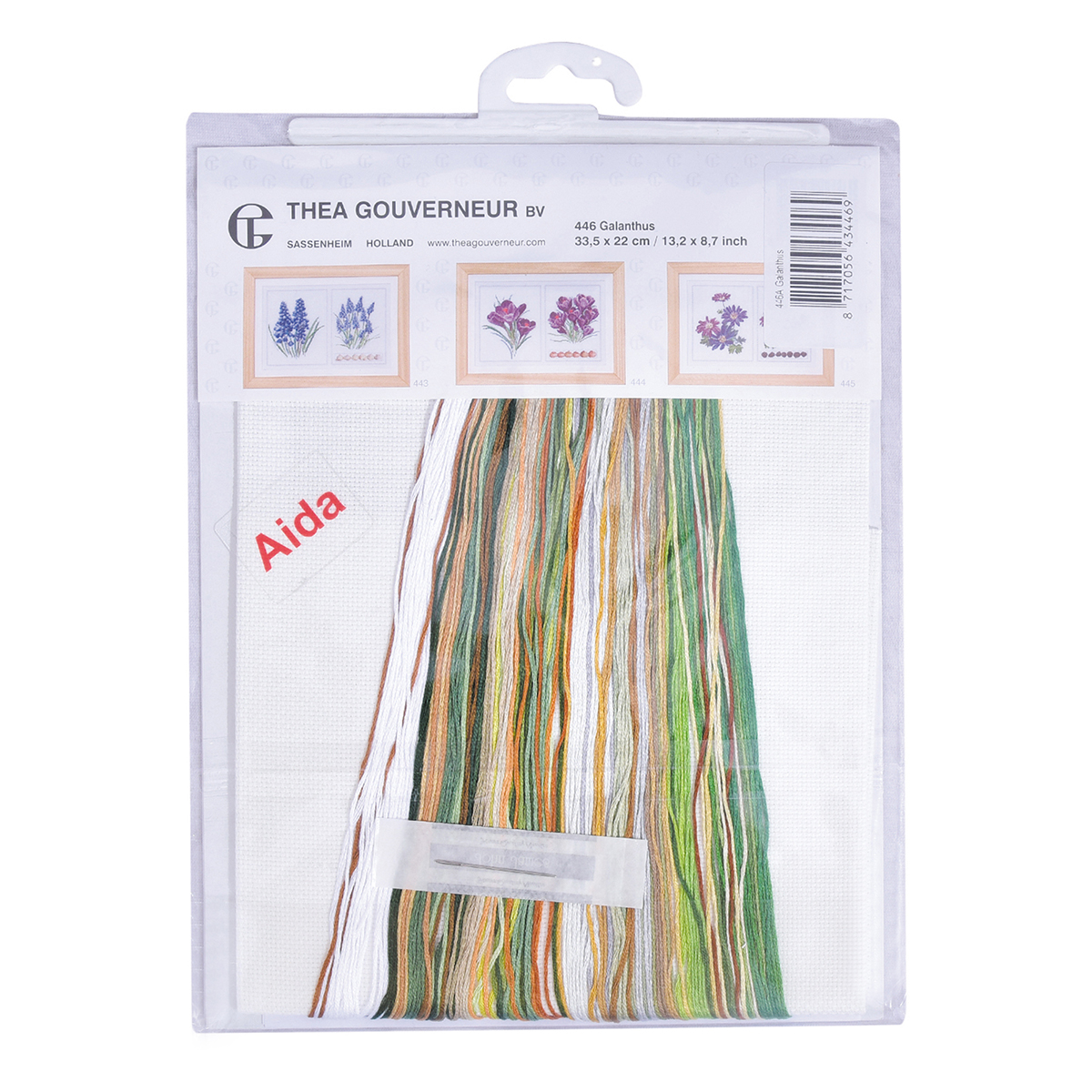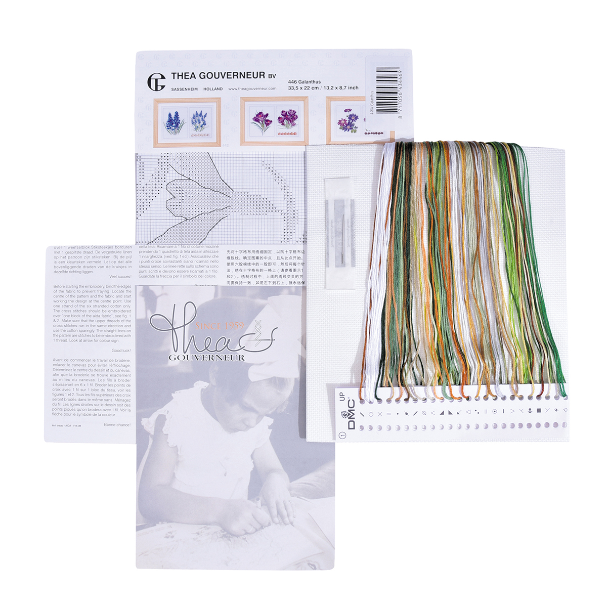Наборы Thea Gouverneur укомплектованы качественными материалами, такими как мулине DMC из 100% хлопка и разные виды тканей для вышивания производства Zweigart. Наборы обозначенные буквой А после номера содержат в составе канву Aida, если в артикуле есть обозначение .05 – то этот набор укомплектован канвой Aida чёрного цвета. Также в ассортименте есть наборы на 100% льне и канве Jobelan. Черно-белые схемы тщательно прорабатываются вручную. Используется богатая цветовая палитра ниток, но в ассортименте компании есть и монохромные дизайны. Нитки разобраны по символам и закреплены на органайзере. Стрелка на бумажном органайзере указывает вверх, определяя правильность чтения символов.