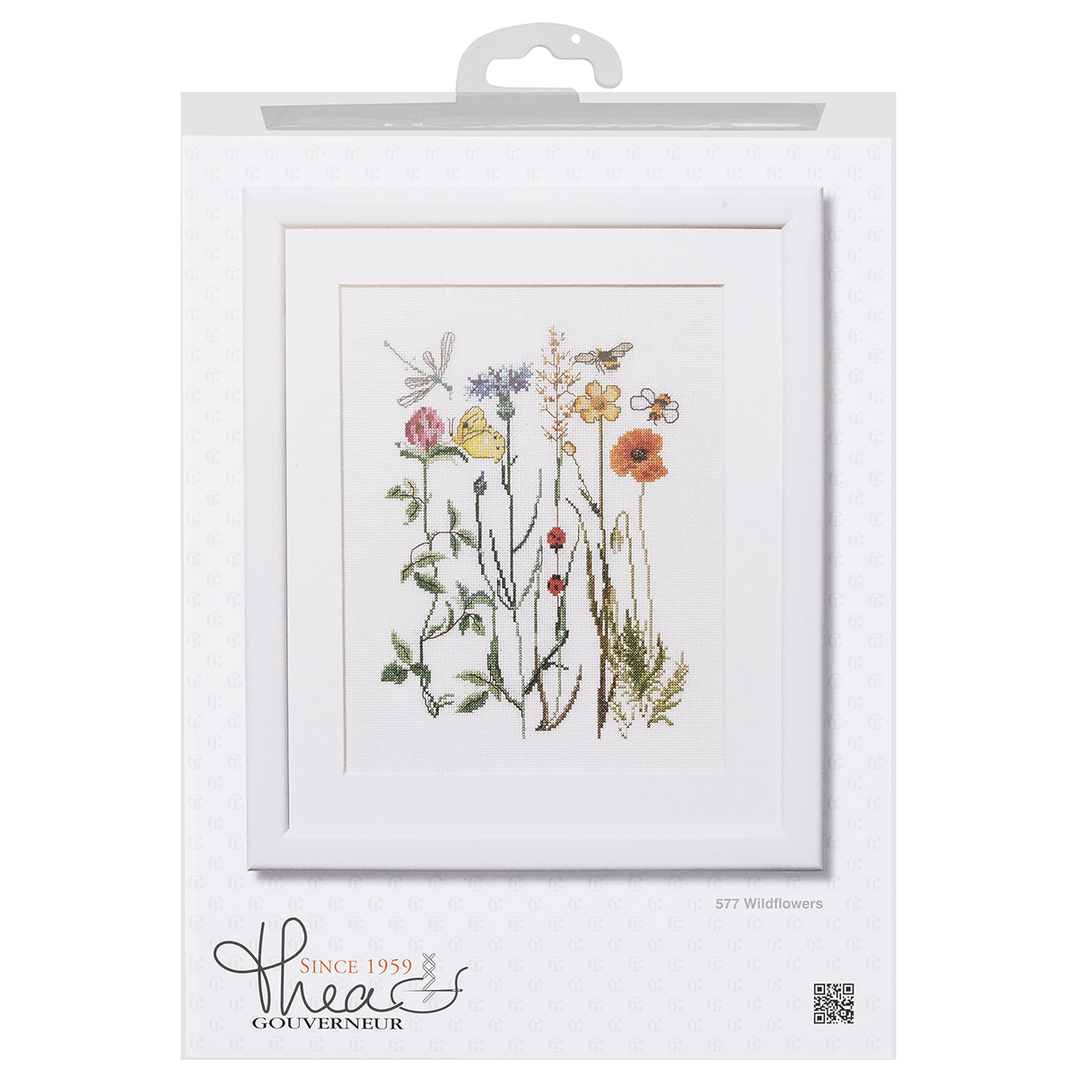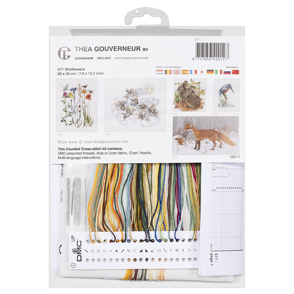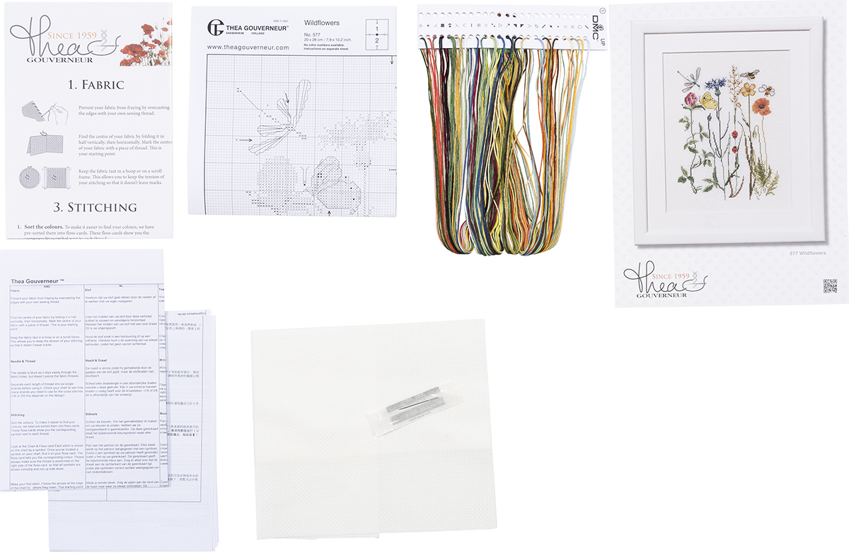Наборы Thea Gouverneur укомплектованы качественными материалами, такими как мулине DMC из 100% хлопка и разные виды тканей для вышивания производства Zweigart. Наборы обозначенные буквой А после номера содержат в составе канву Aida, если в артикуле есть обозначение .05 – то этот набор укомплектован канвой Aida чёрного цвета. Также в ассортименте есть наборы на 100% льне и канве Jobelan. Черно-белые схемы тщательно прорабатываются вручную. Используется богатая цветовая палитра ниток, но в ассортименте компании есть и монохромные дизайны. Нитки разобраны по символам и закреплены на органайзере. Стрелка на бумажном органайзере указывает вверх, определяя правильность чтения символов.