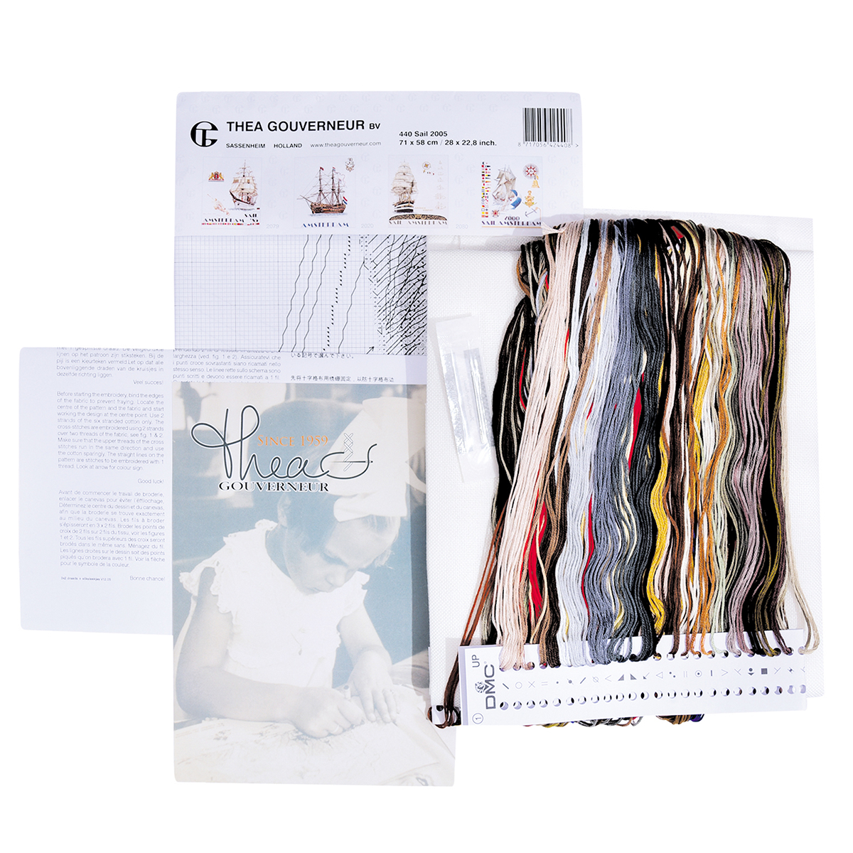 Наборы Thea Gouverneur  укомплектованы качественными материалами, такими как мулине DMC из 100% хлопка и разные виды тканей для вышивания производства Zweigart. Наборы обозначенные буквой А после номера содержат в составе канву Aida, если в артикуле есть обозначение .05 – то этот набор укомплектован канвой Aida чёрного цвета. Также в ассортименте есть наборы на 100% льне и канве Jobelan. Черно-белые схемы тщательно прорабатываются вручную. Используется богатая цветовая палитра ниток, но в ассортименте компании есть и монохромные дизайны. Нитки разобраны по символам и закреплены на органайзере. Стрелка на бумажном органайзере указывает вверх, определяя правильность чтения символов.