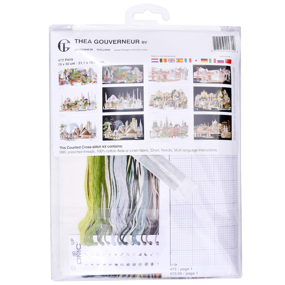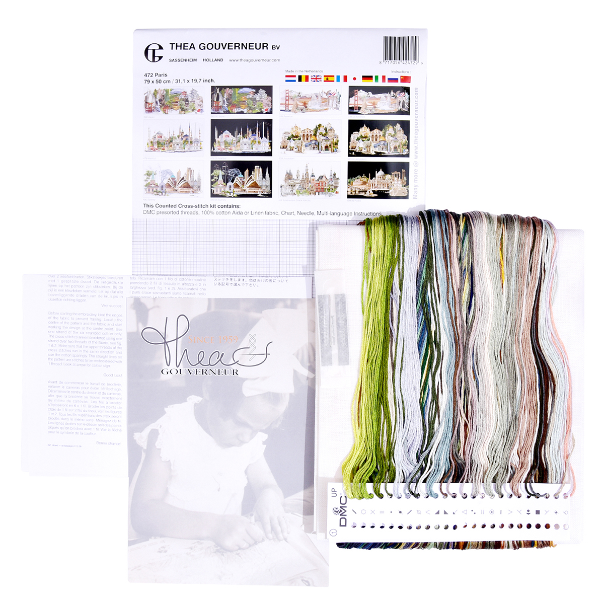 Наборы Thea Gouverneur укомплектованы качественными материалами, такими как мулине DMC из 100% хлопка и разные виды тканей для вышивания производства Zweigart. Наборы обозначенные буквой А после номера содержат в составе канву Aida, если в артикуле есть обозначение .05 – то этот набор укомплектован канвой Aida чёрного цвета. Также в ассортименте есть наборы на 100% льне и канве Jobelan. Черно-белые схемы тщательно прорабатываются вручную. Используется богатая цветовая палитра ниток, но в ассортименте компании есть и монохромные дизайны. Нитки разобраны по символам и закреплены на органайзере. Стрелка на бумажном органайзере указывает вверх, определяя правильность чтения символов.