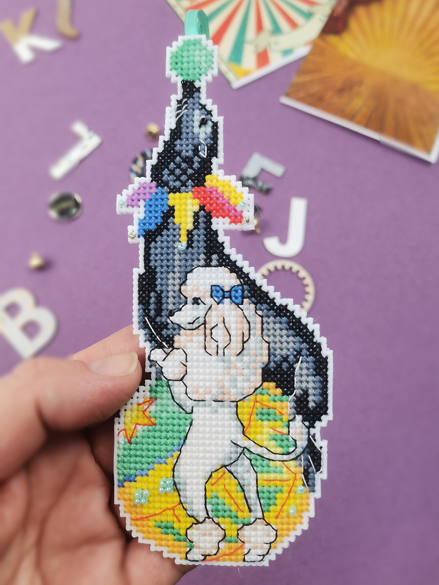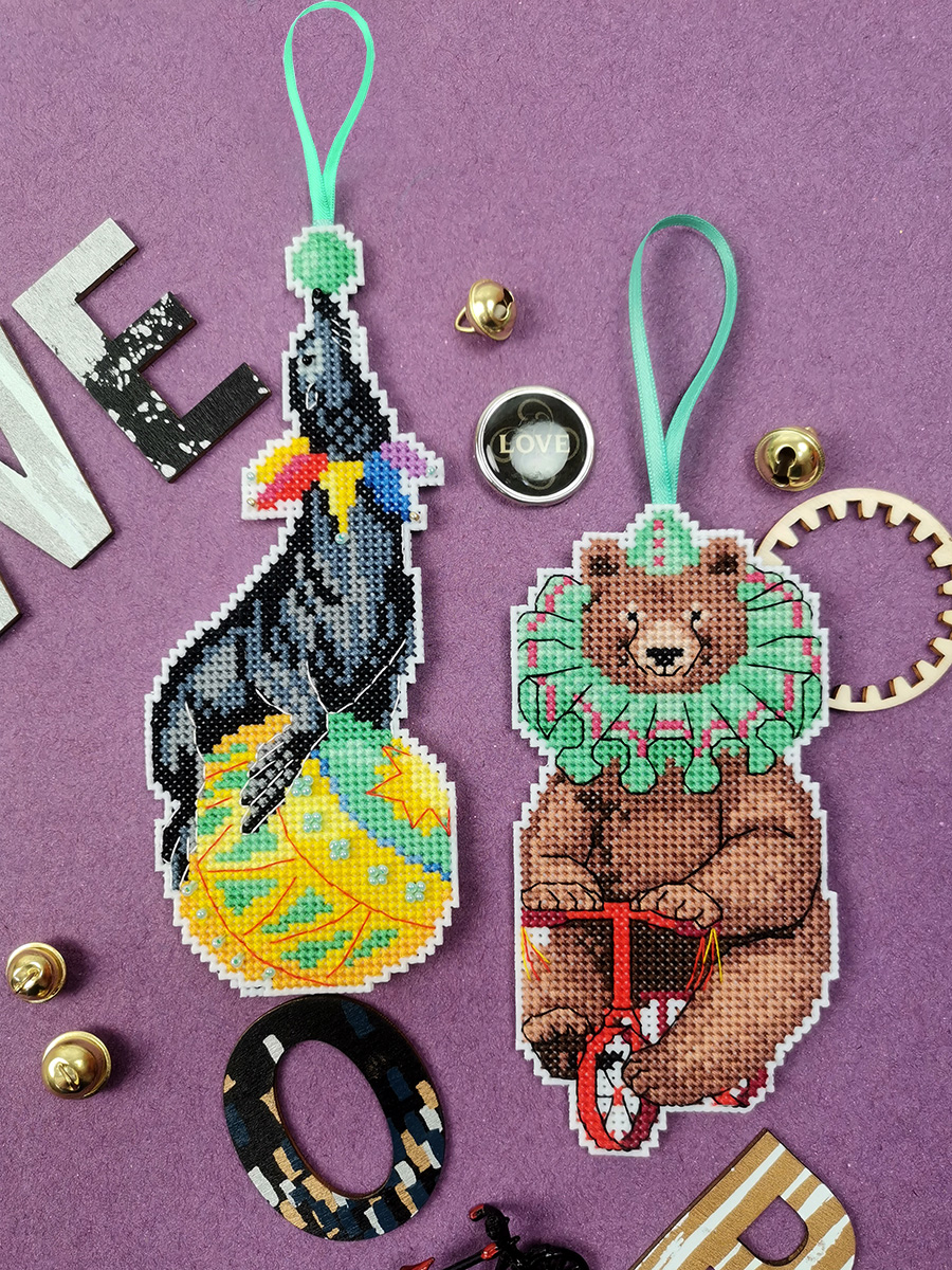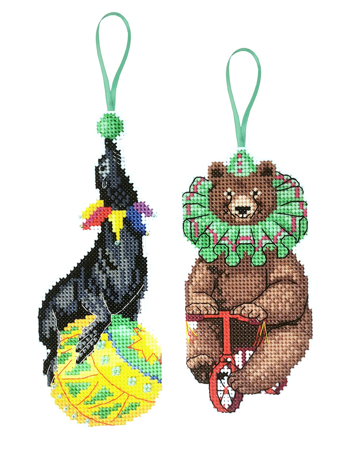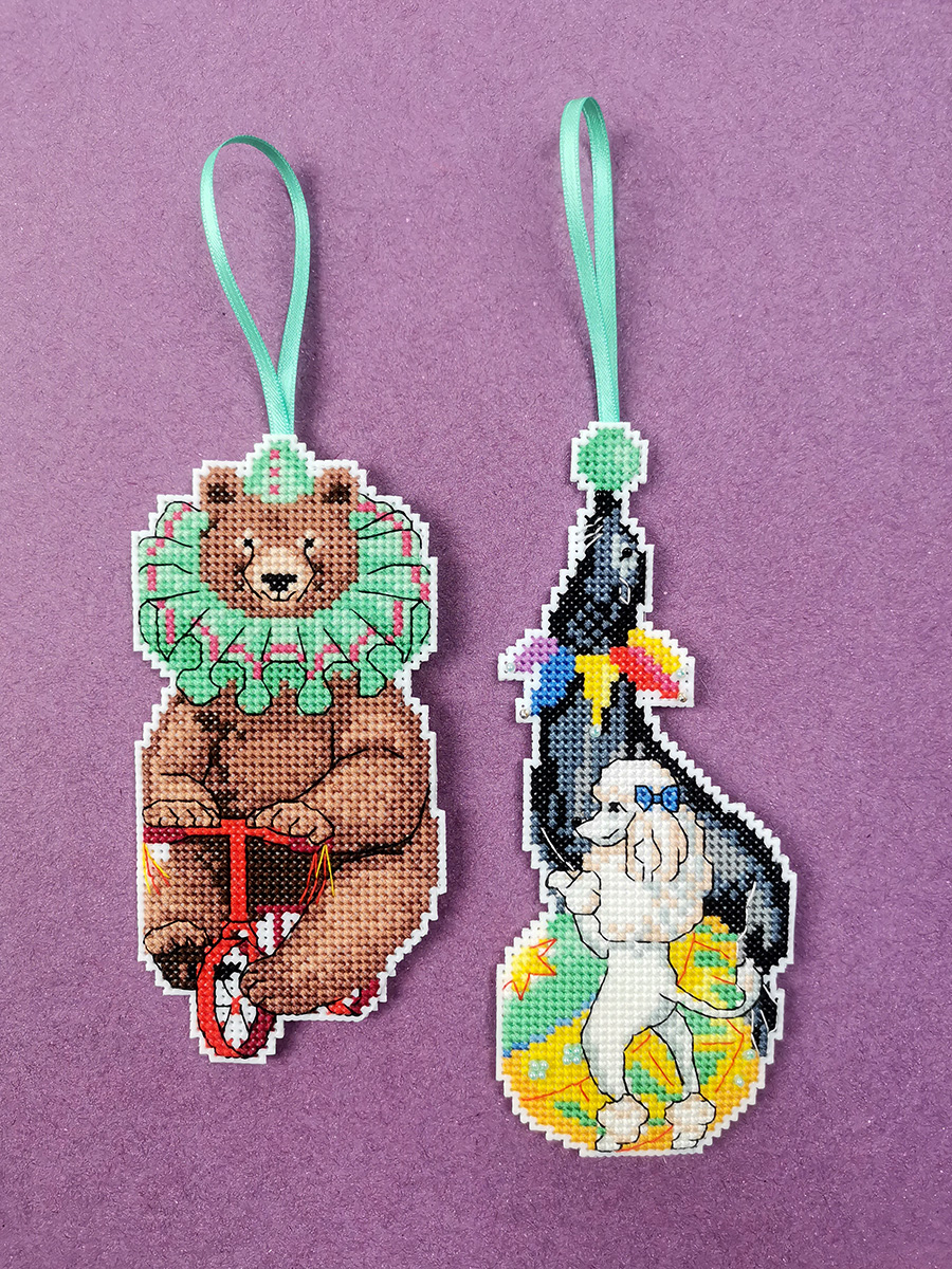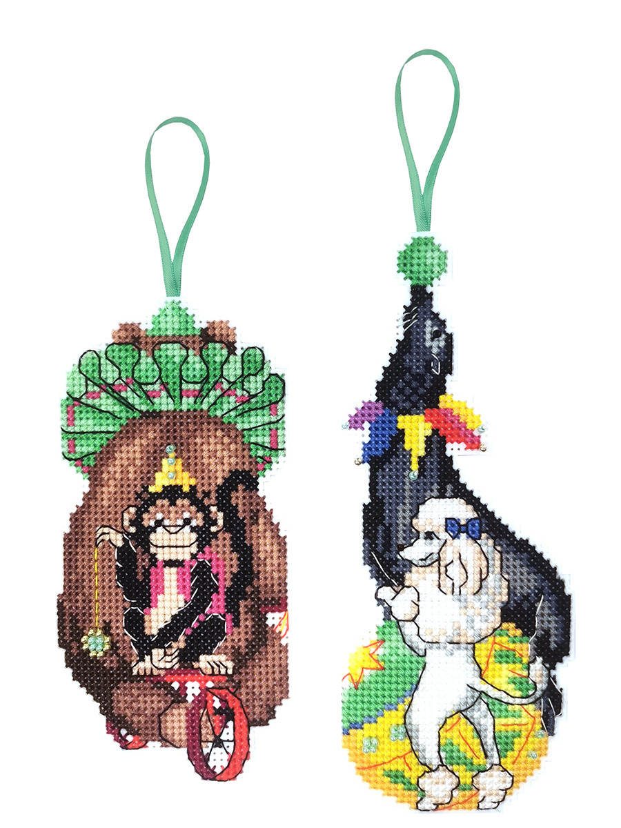 Канва пластиковая белая, мулине Finca 22 цв.,бисер, игла, инструкция, тесьма, схема комбинированная. В наборе две игрушки 7х13см