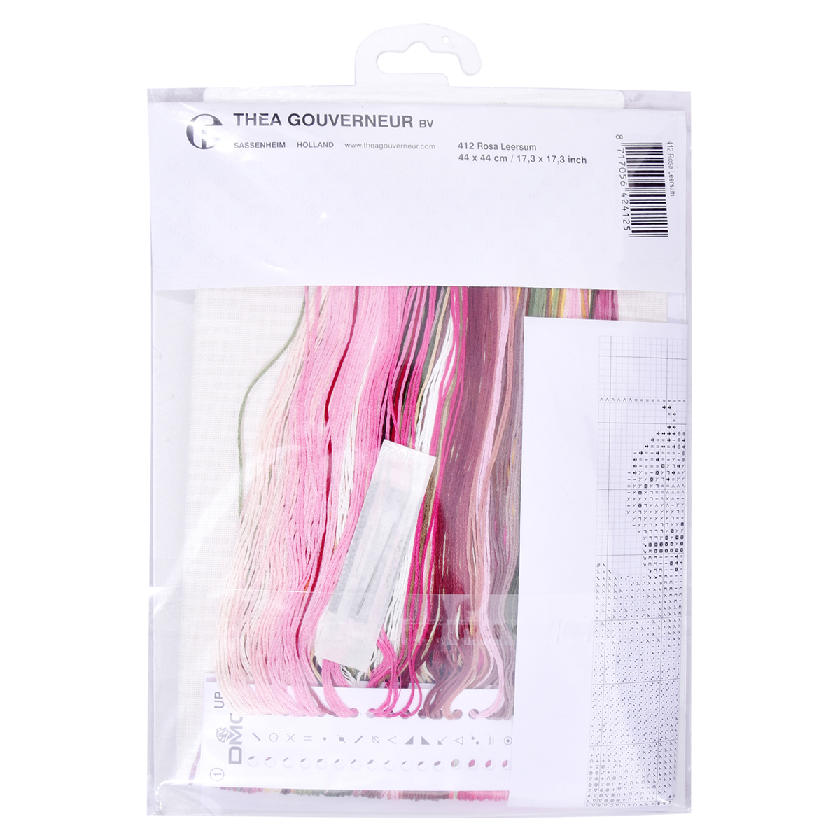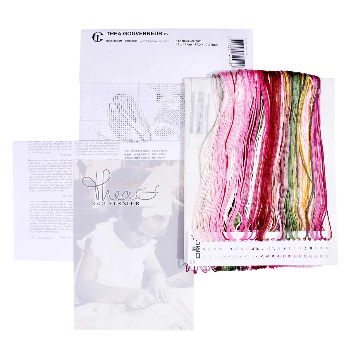 Наборы Thea Gouverneur укомплектованы качественными материалами, такими как мулине DMC из 100% хлопка и разные виды тканей для вышивания производства Zweigart. Наборы обозначенные буквой А после номера содержат в составе канву Aida, если в артикуле есть обозначение .05 – то этот набор укомплектован канвой Aida чёрного цвета. Также в ассортименте есть наборы на 100% льне и канве Jobelan. Черно-белые схемы тщательно прорабатываются вручную. Используется богатая цветовая палитра ниток, но в ассортименте компании есть и монохромные дизайны. Нитки разобраны по символам и закреплены на органайзере. Стрелка на бумажном органайзере указывает вверх, определяя правильность чтения символов.