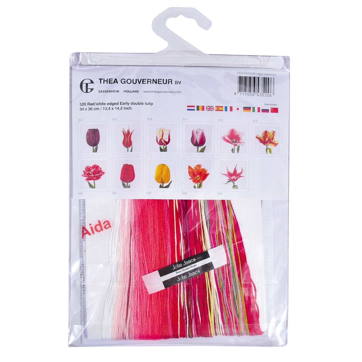 Наборы Thea Gouverneur укомплектованы качественными материалами, такими как мулине DMC из 100% хлопка и разные виды тканей для вышивания производства Zweigart. Наборы обозначенные буквой А после номера содержат в составе канву Aida, если в артикуле есть обозначение .05 – то этот набор укомплектован канвой Aida чёрного цвета. Также в ассортименте есть наборы на 100% льне и канве Jobelan. Черно-белые схемы тщательно прорабатываются вручную. Используется богатая цветовая палитра ниток, но в ассортименте компании есть и монохромные дизайны. Нитки разобраны по символам и закреплены на органайзере. Стрелка на бумажном органайзере указывает вверх, определяя правильность чтения символов.