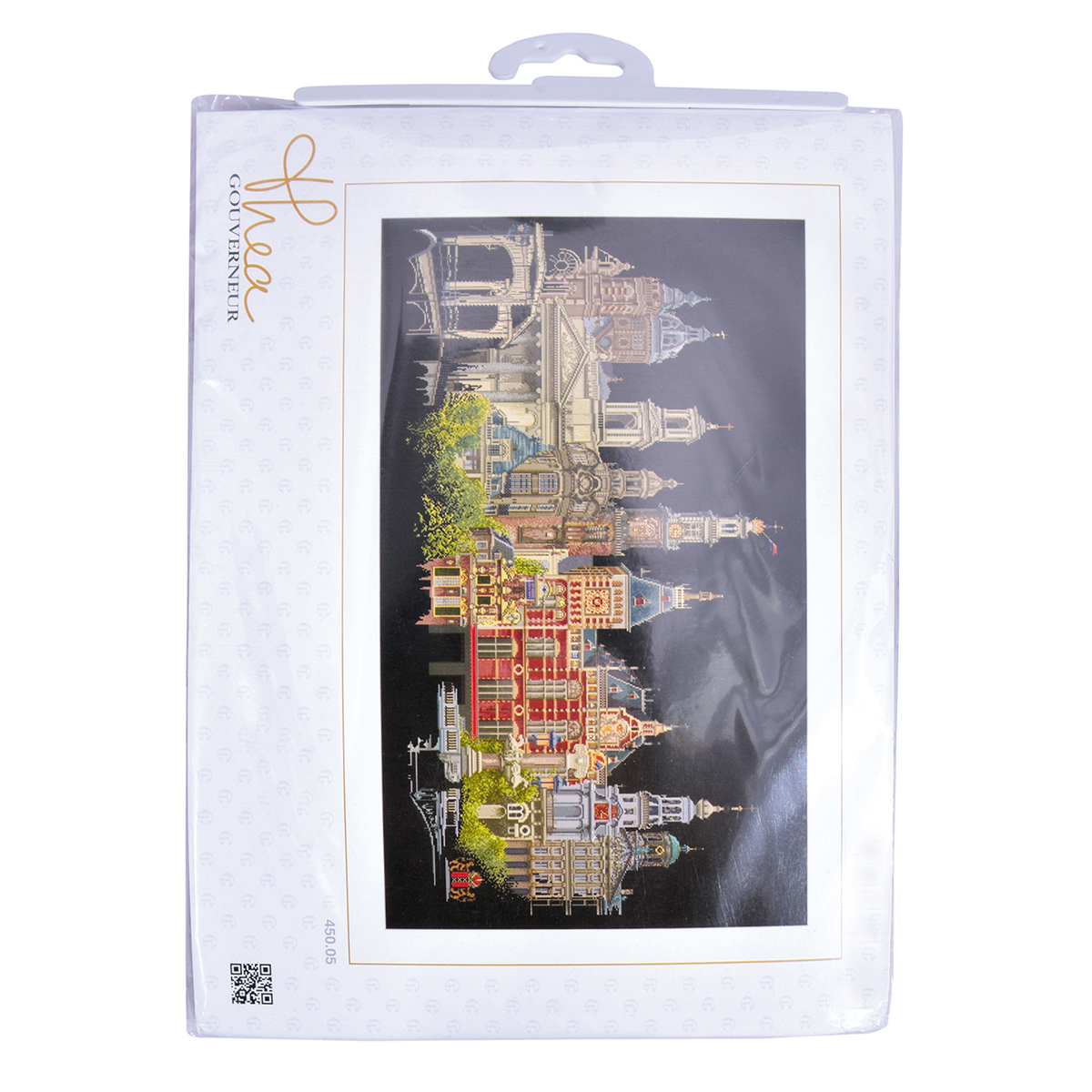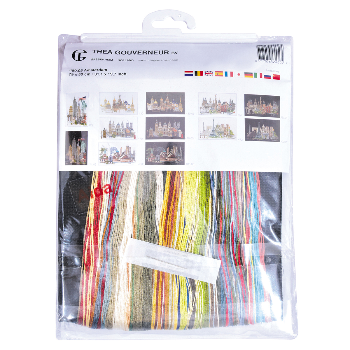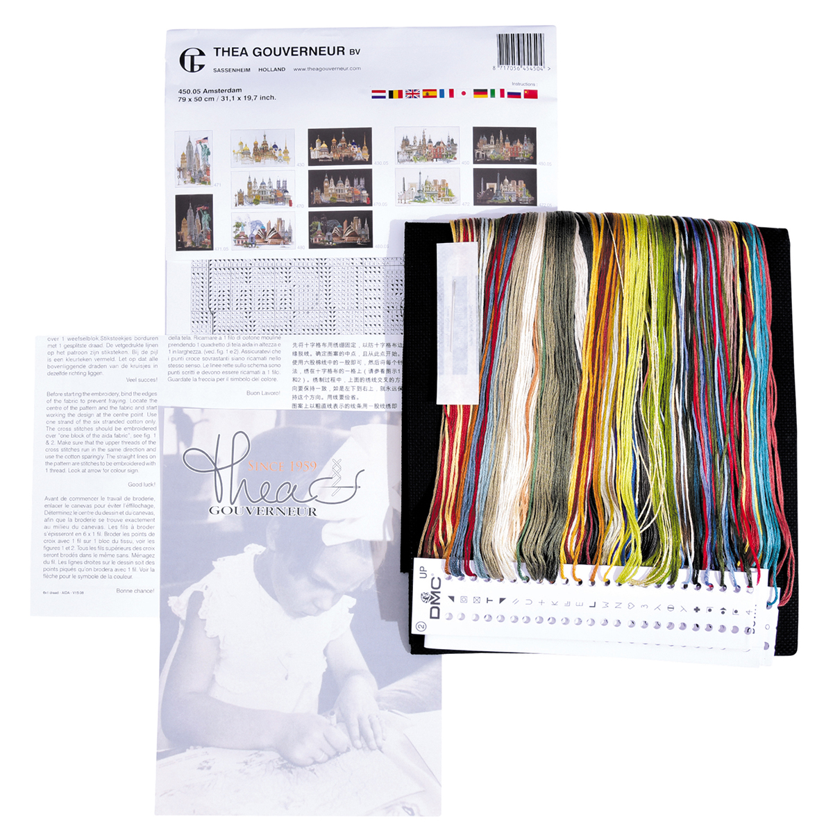 Наборы Thea Gouverneur укомплектованы качественными материалами, такими как мулине DMC из 100% хлопка и разные виды тканей для вышивания производства Zweigart. Наборы обозначенные буквой А после номера содержат в составе канву Aida, если в артикуле есть обозначение .05 – то этот набор укомплектован канвой Aida чёрного цвета. Также в ассортименте есть наборы на 100% льне и канве Jobelan. Черно-белые схемы тщательно прорабатываются вручную. Используется богатая цветовая палитра ниток, но в ассортименте компании есть и монохромные дизайны. Нитки разобраны по символам и закреплены на органайзере. Стрелка на бумажном органайзере указывает вверх, определяя правильность чтения символов.