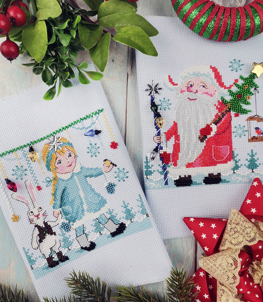Серию объединяют размер, основа Аида 14ct, частичная вышивка бисером и декоративные пришивные элементы. Мулине Finca не разобраны на планшетки, а связаны узелком. Схема и инструкция черно-белая. Электронная схема XSD, QR код в наборе, указание о наличие схемы - знак на обложке.