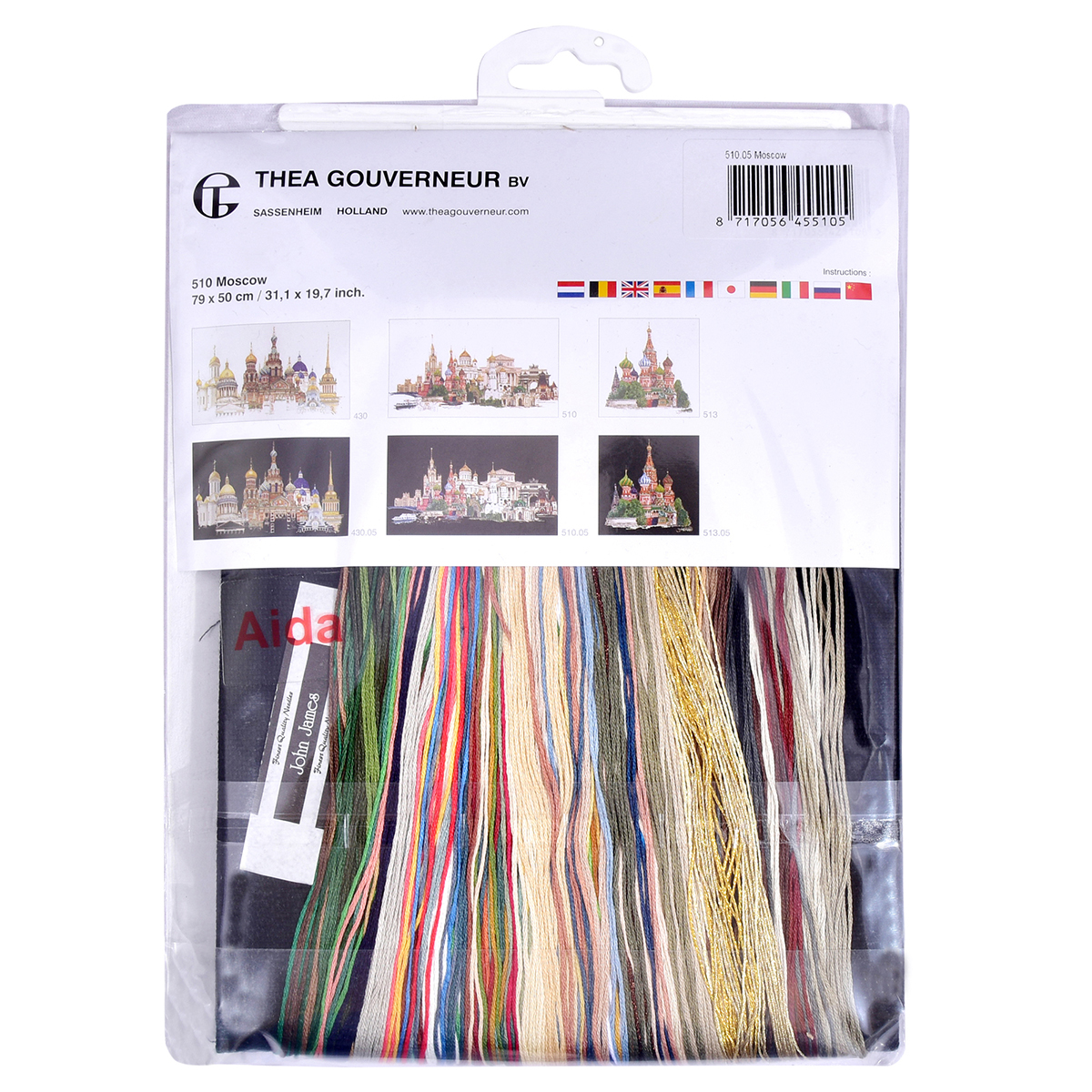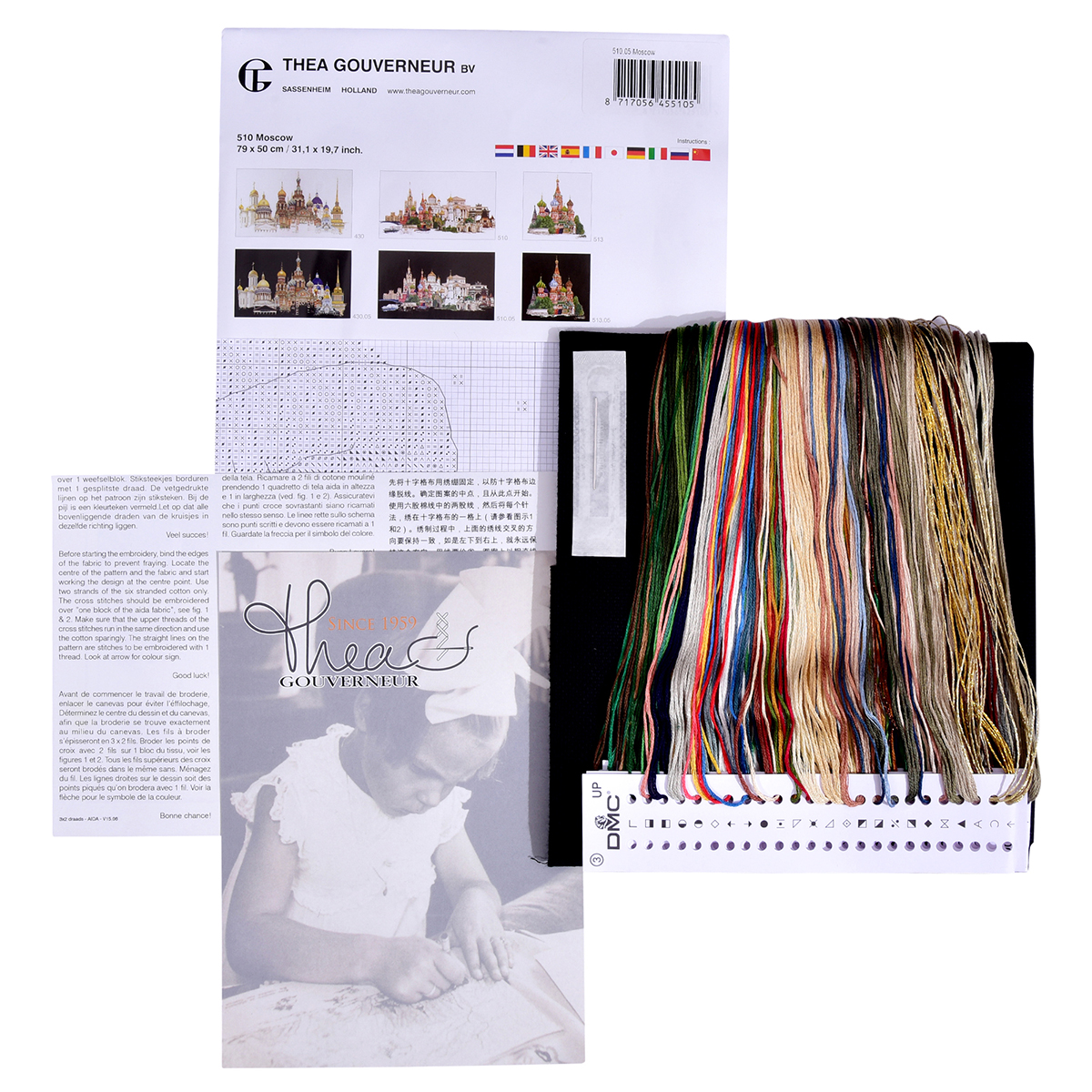 Наборы Thea Gouverneur укомплектованы качественными материалами, такими как мулине DMC из 100% хлопка и разные виды тканей для вышивания производства Zweigart. Наборы обозначенные буквой А после номера содержат в составе канву Aida, если в артикуле есть обозначение .05 – то этот набор укомплектован канвой Aida чёрного цвета. Также в ассортименте есть наборы на 100% льне и канве Jobelan. Черно-белые схемы тщательно прорабатываются вручную. Используется богатая цветовая палитра ниток, но в ассортименте компании есть и монохромные дизайны. Нитки разобраны по символам и закреплены на органайзере. Стрелка на бумажном органайзере указывает вверх, определяя правильность чтения символов.